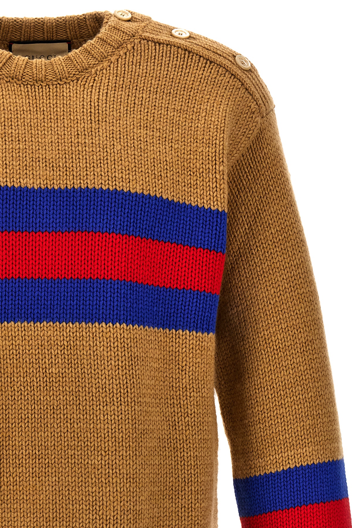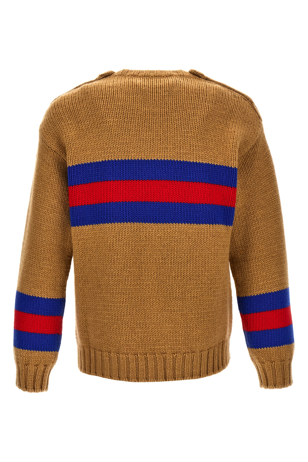 Wool blend sweater with web ribbon inlaid detail, crewneck, and long cuffed sleeves.