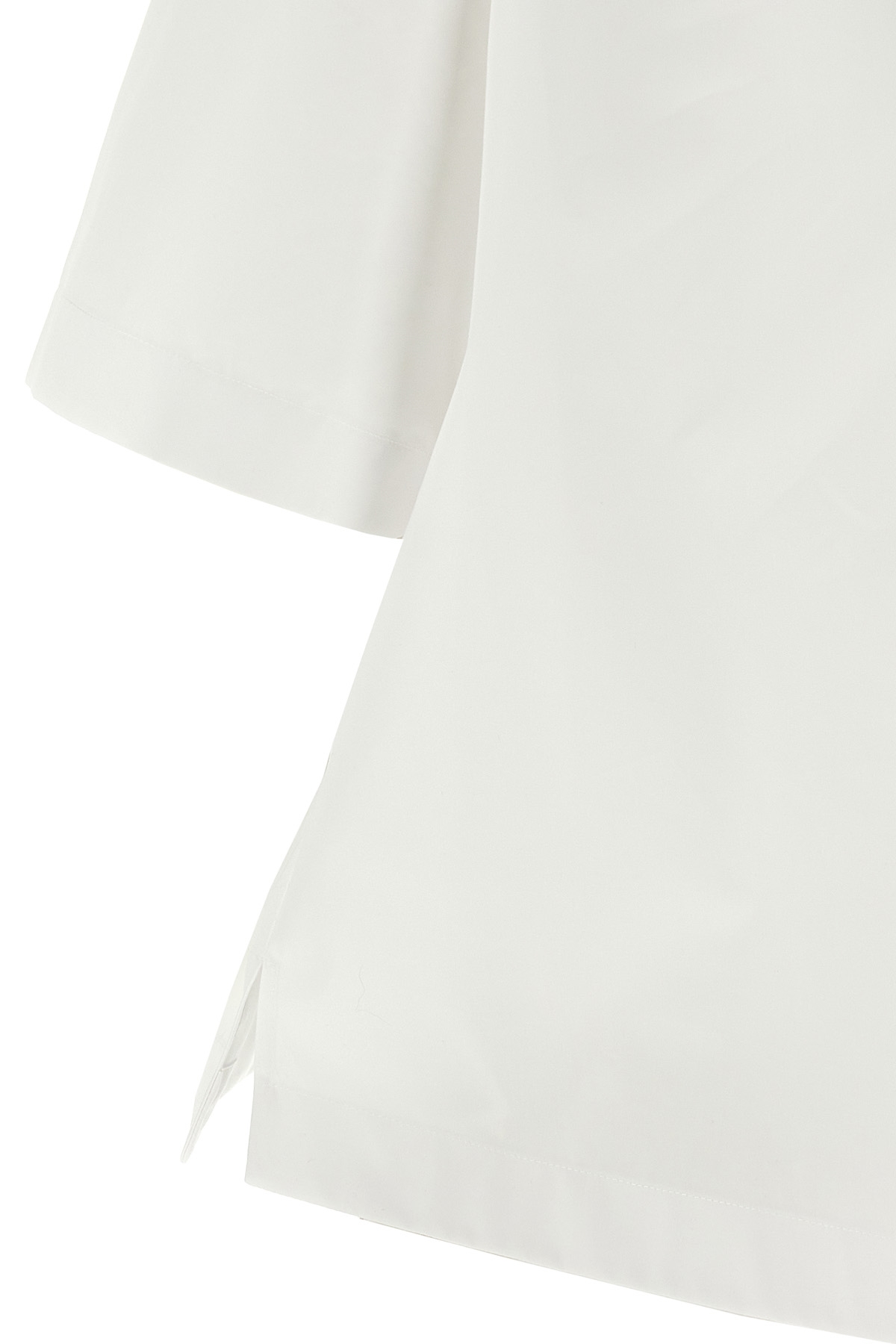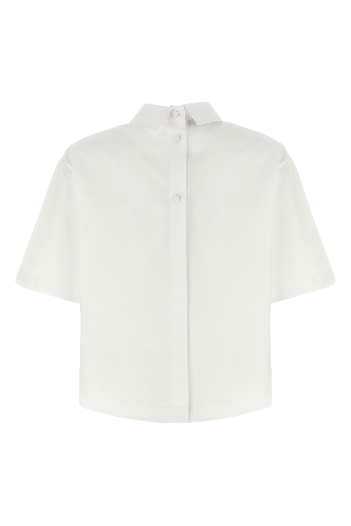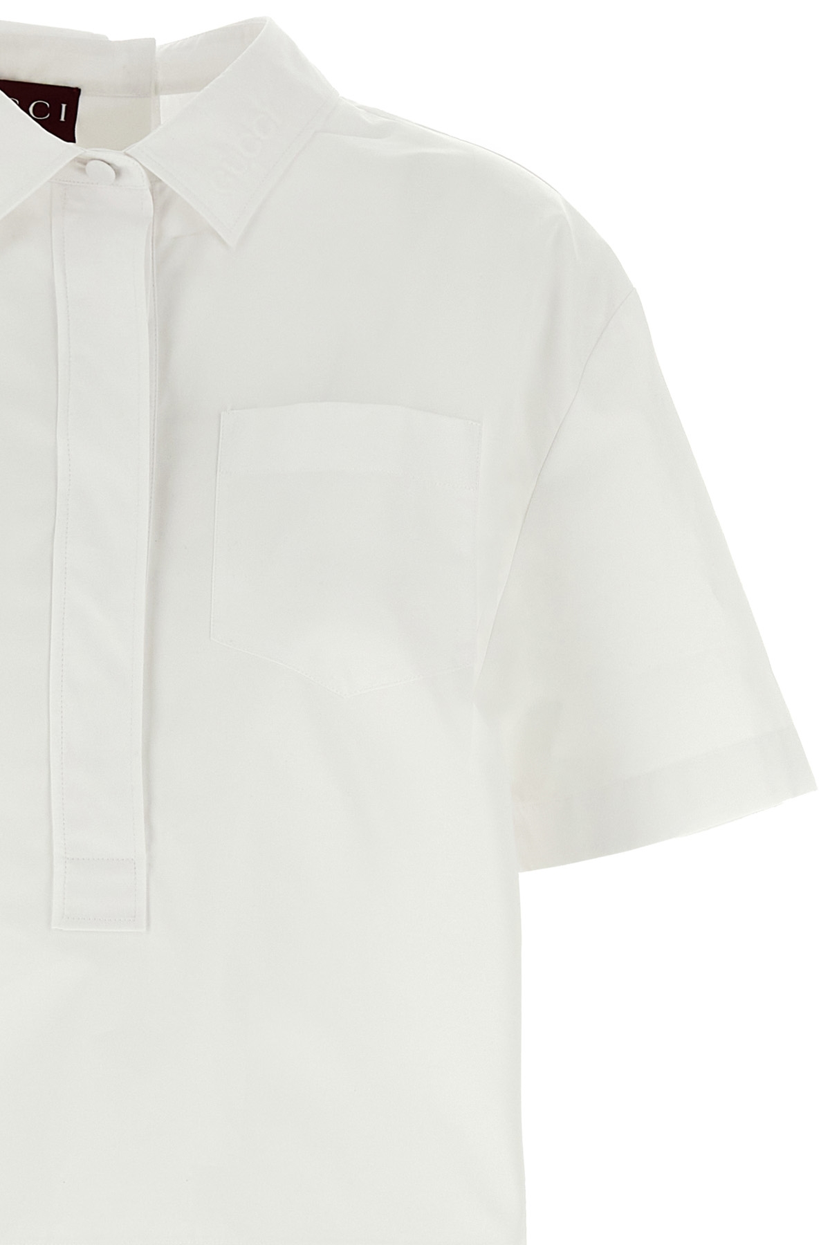 Cotton poplin shirt, pointed collar with embossed logo, breast pocket, button closure on the front and back, and short sleeves.