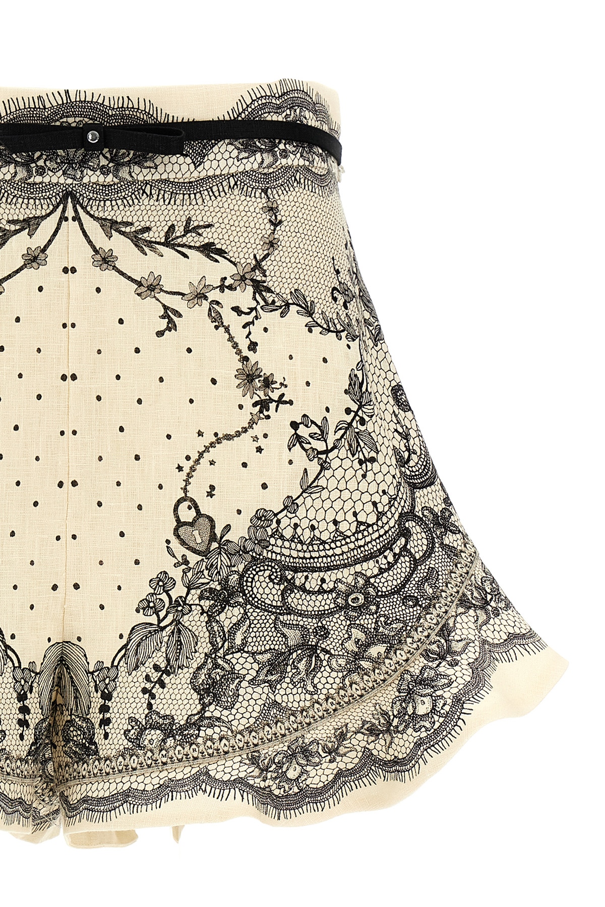 'Crush Flat Front Frill' shorts in linen and silk blend with graphic print, back zip closure, adjustable and removable bow and rhinestone belt.
