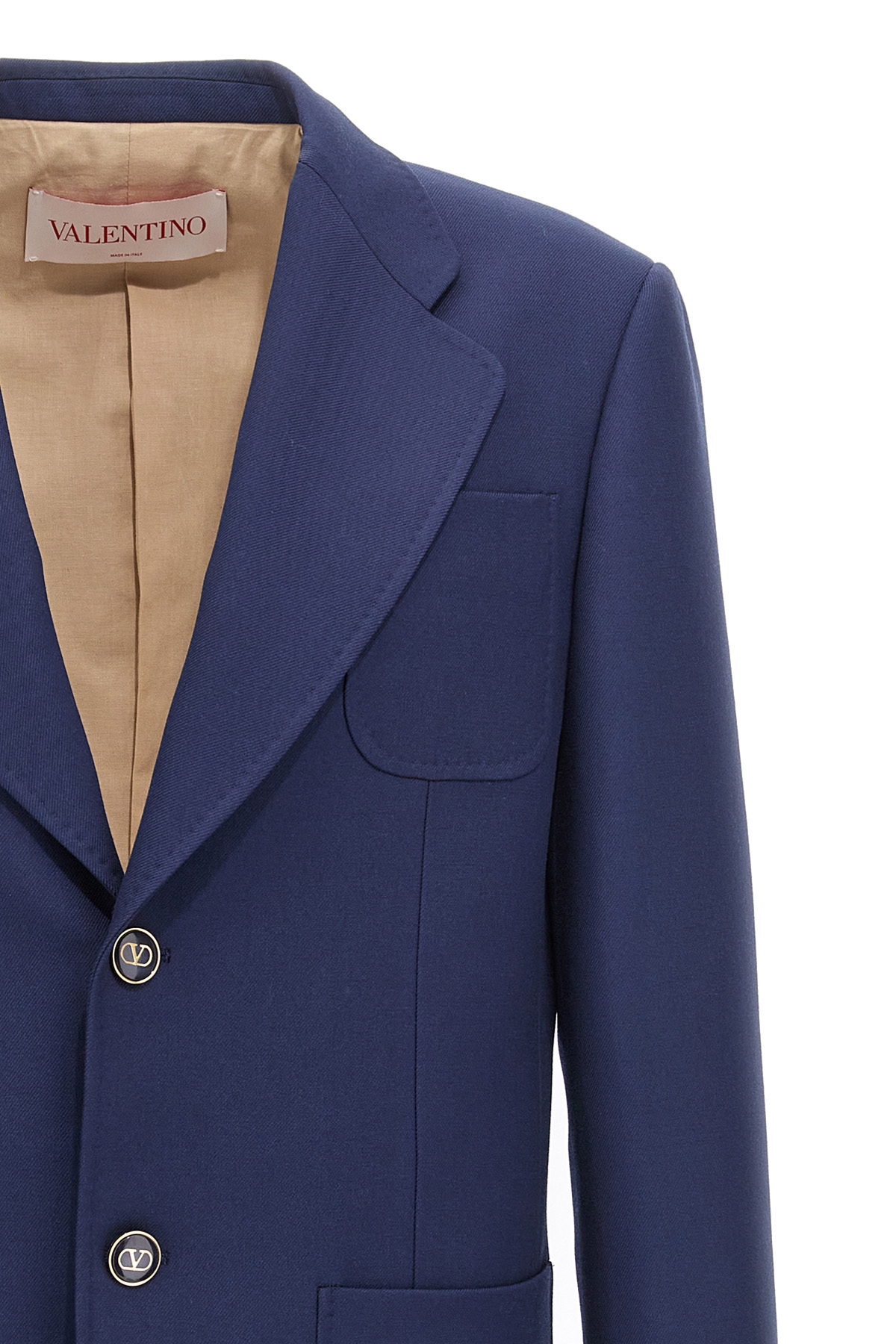 Single-breasted virgin wool blazer with mirror lapels, button closure, pockets, long sleeves, slightly padded shoulder straps, back vents.
