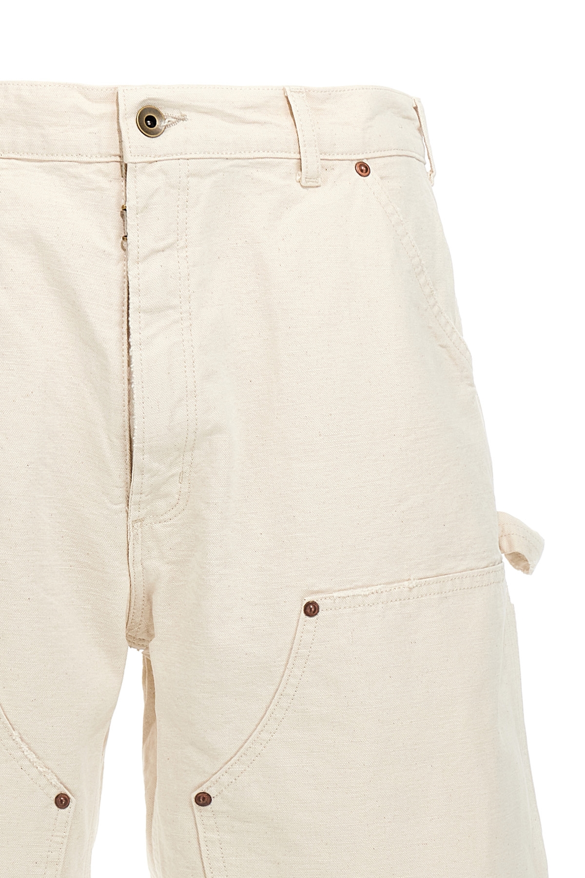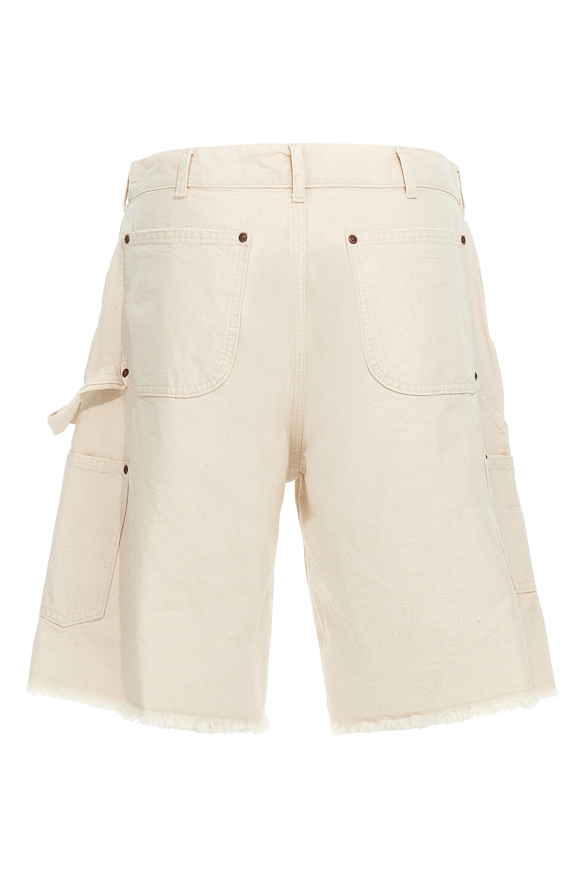 Cotton denim bermuda shorts with zip and button closure, pockets with metal rivets, fringes on the leg bottoms.