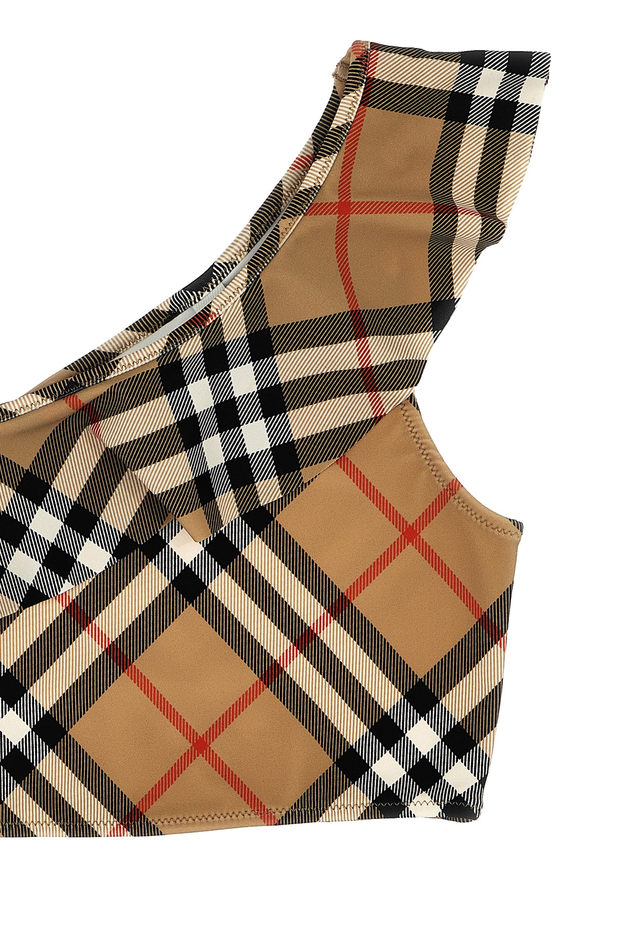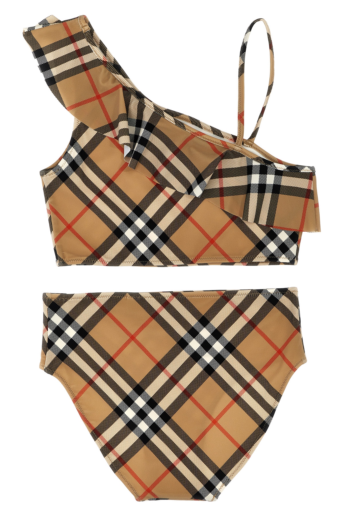 KIDS Burberry check stretch fabric Asla bikini, asymmetrical top with ruffles, wide, narrow shoulder straps, and high-waisted bottoms. SUSTAINABLE: product made from recycled materials.