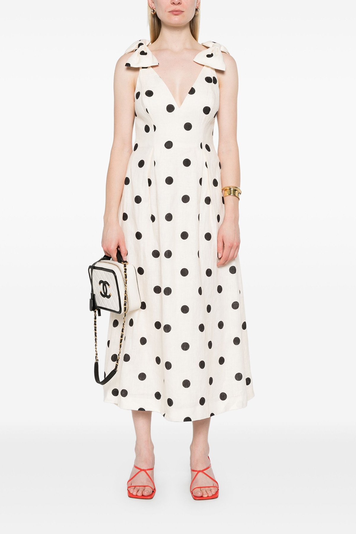 'Crush V Neck Midi' sleeveless dress with V-neck at the front and back, shoulder straps with removable bow decoration, front pins, back zip closure.