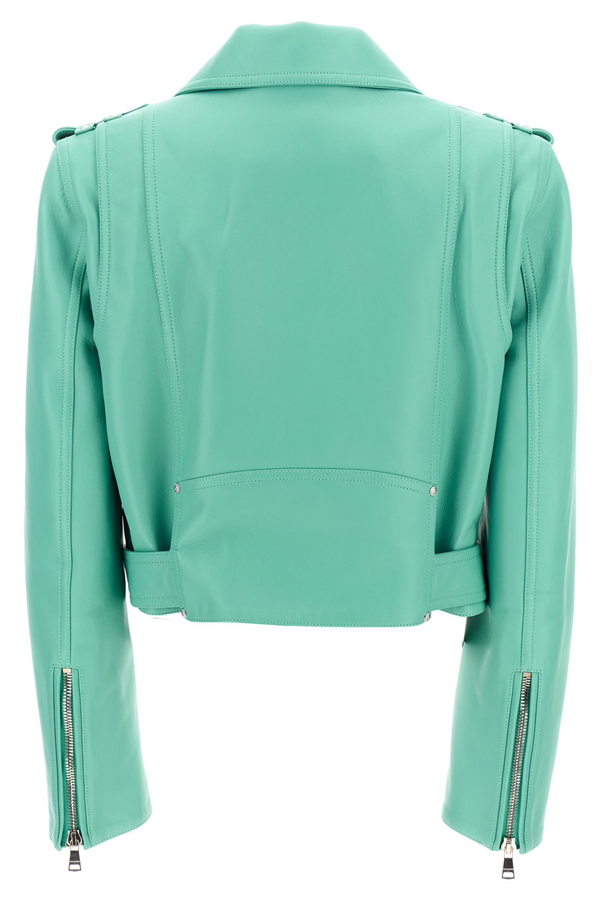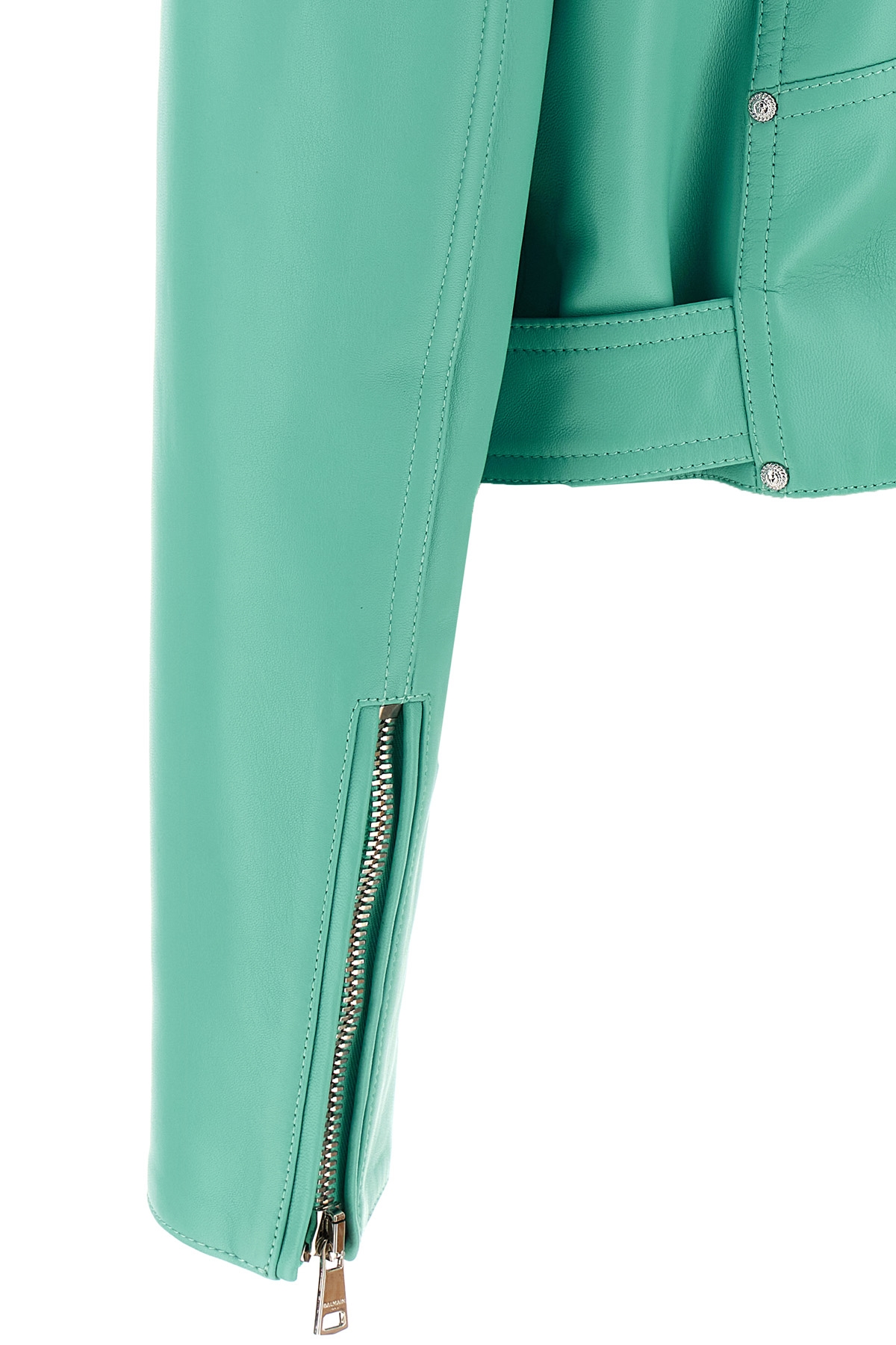 'Biker' leather biker jacket, zip closure, belt at the waist, pockets, long sleeves, logo buttons.