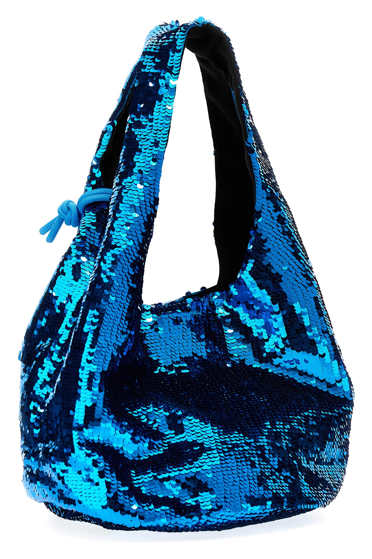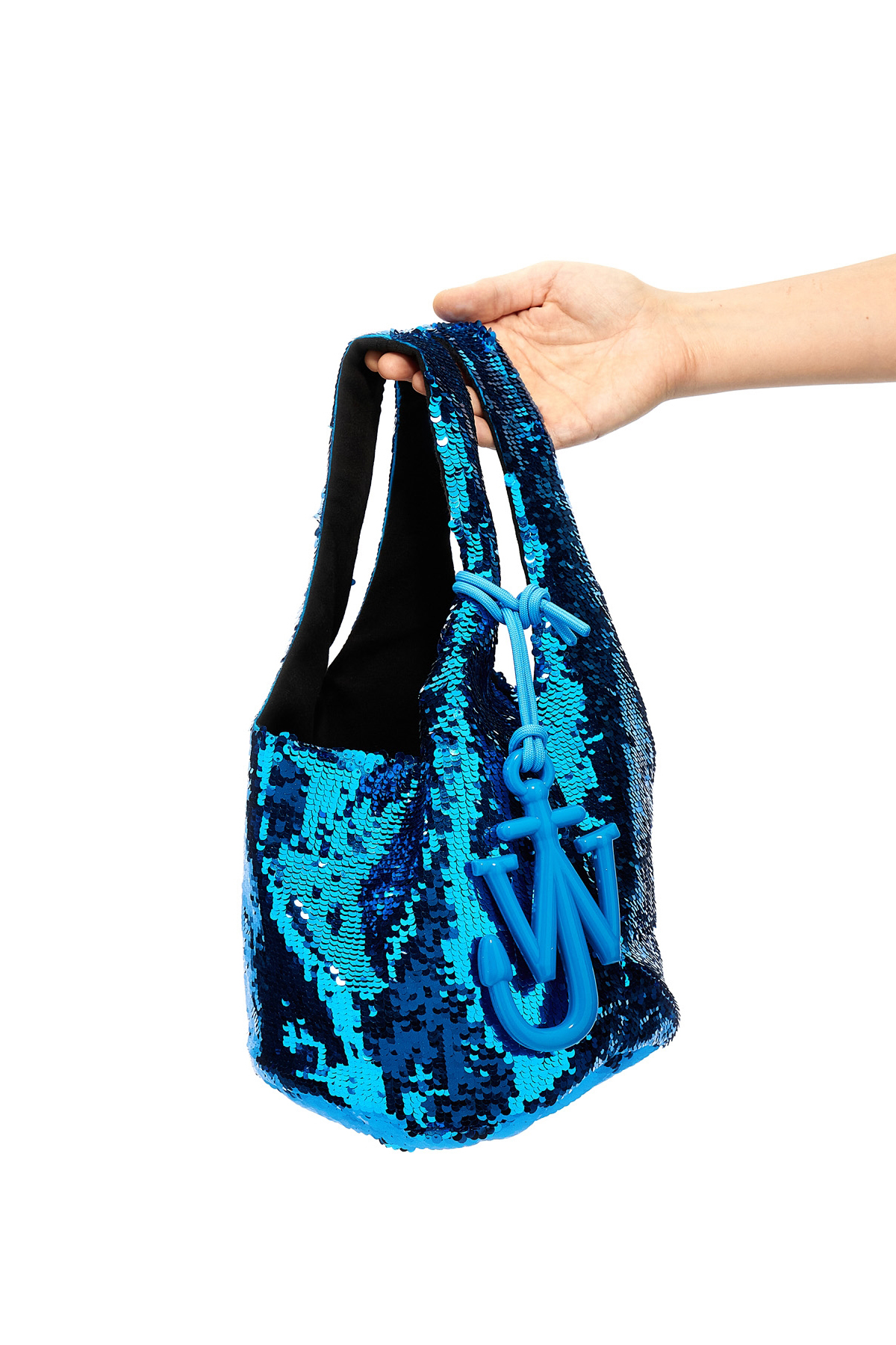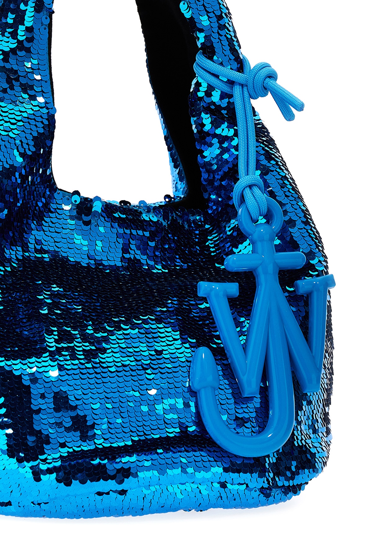 Mini Sequin' fabric shopping bag with all-over sequin applique, double handle, magnetic button closure, removable tone-on-tone silicone Anchor JWA logo pendant.
