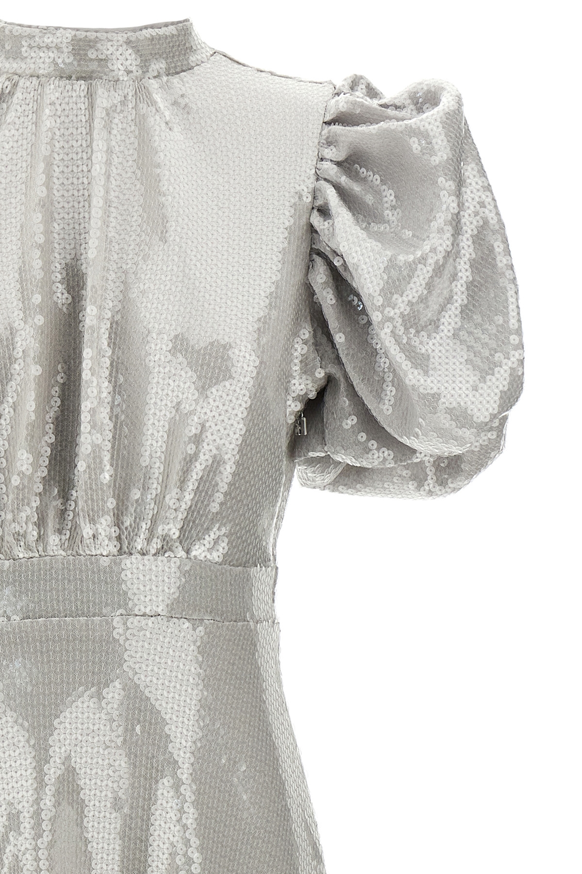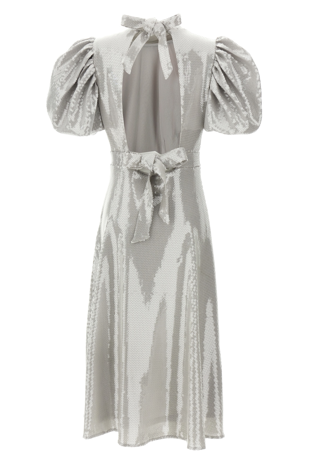Midi dress with all-over sequins, ribbon fastening at the neck and waist, short puff sleeves.