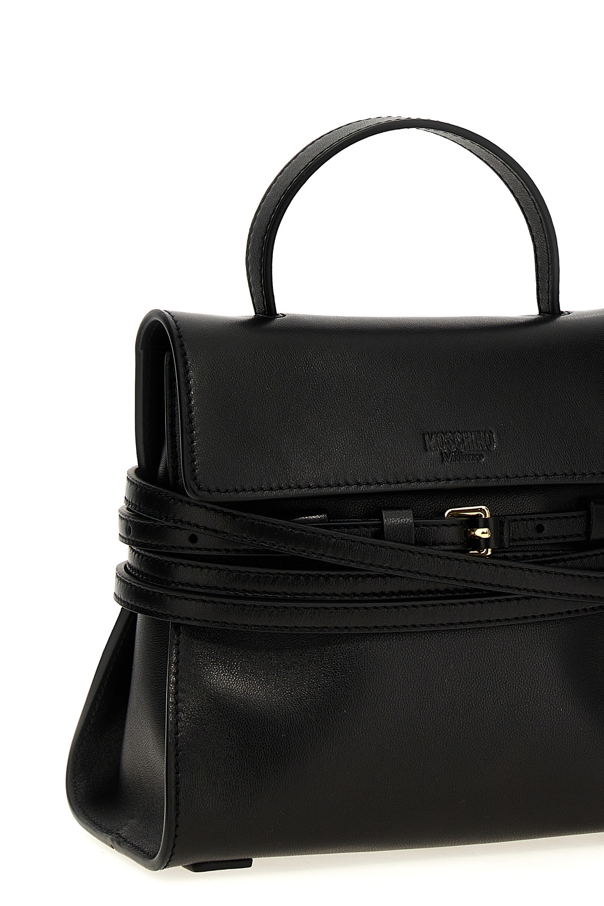 'Moschino Tie Me Bag Small' nappa handbag with fixed handle, magnetic flap closure with embossed logo, removable decorative belt, adjustable and removable shoulder strap.