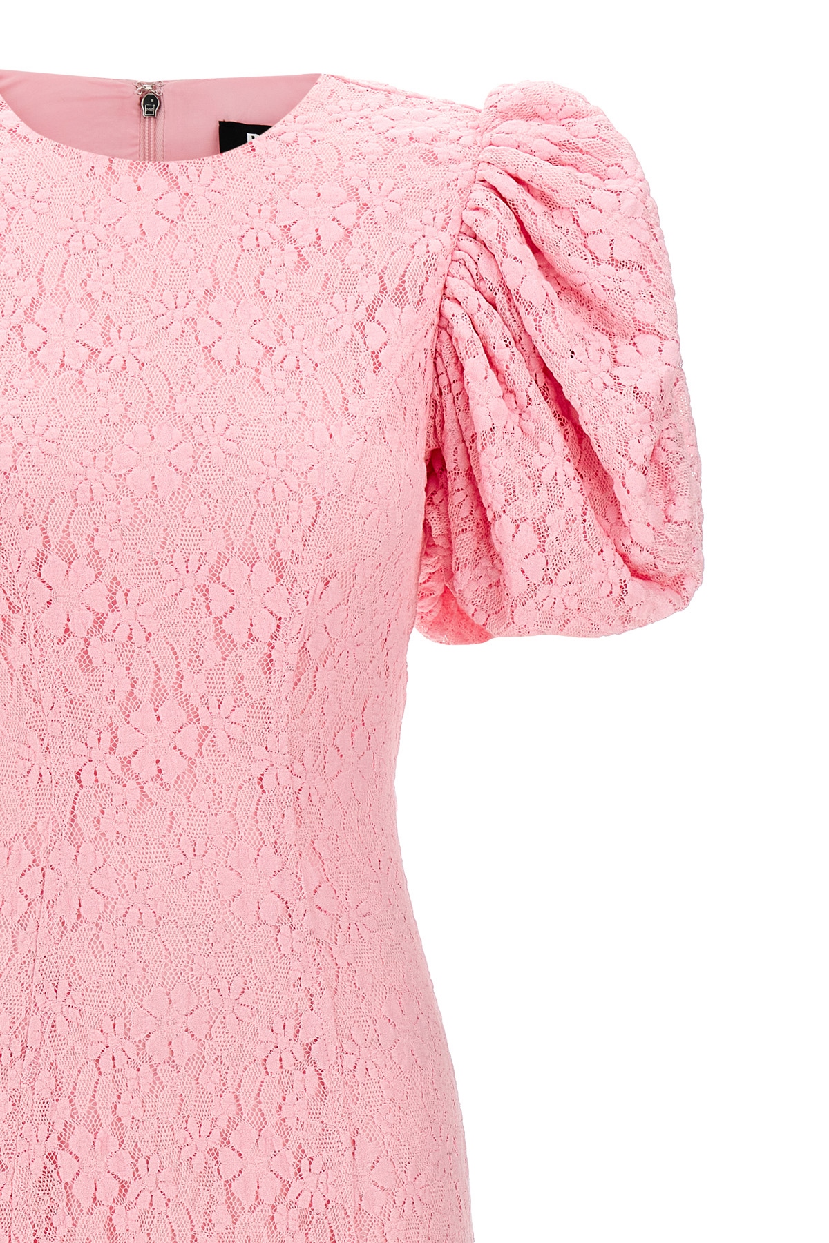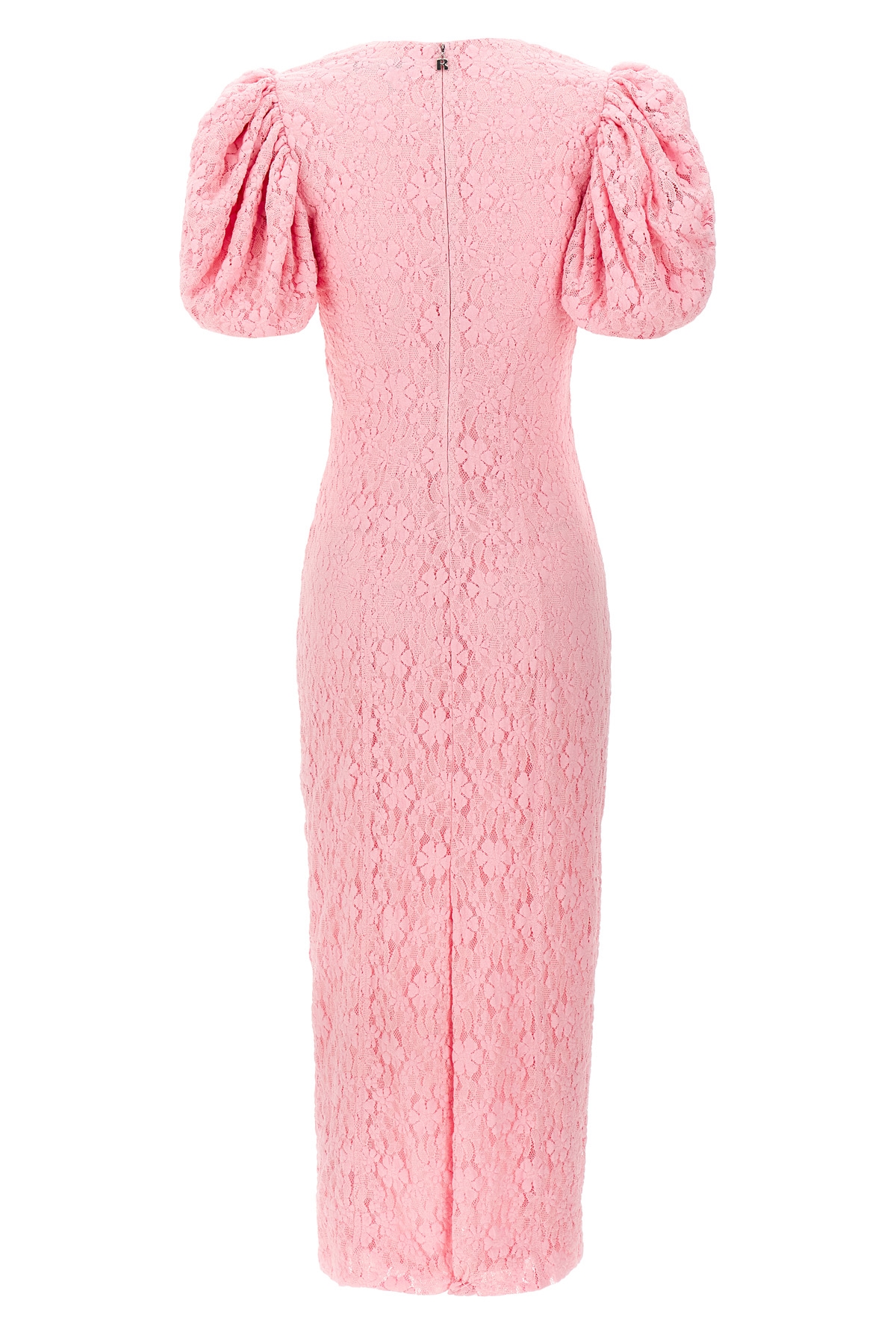 Lace midi dress, sheath dress, puff sleeves, Round neckline, back zip closure.