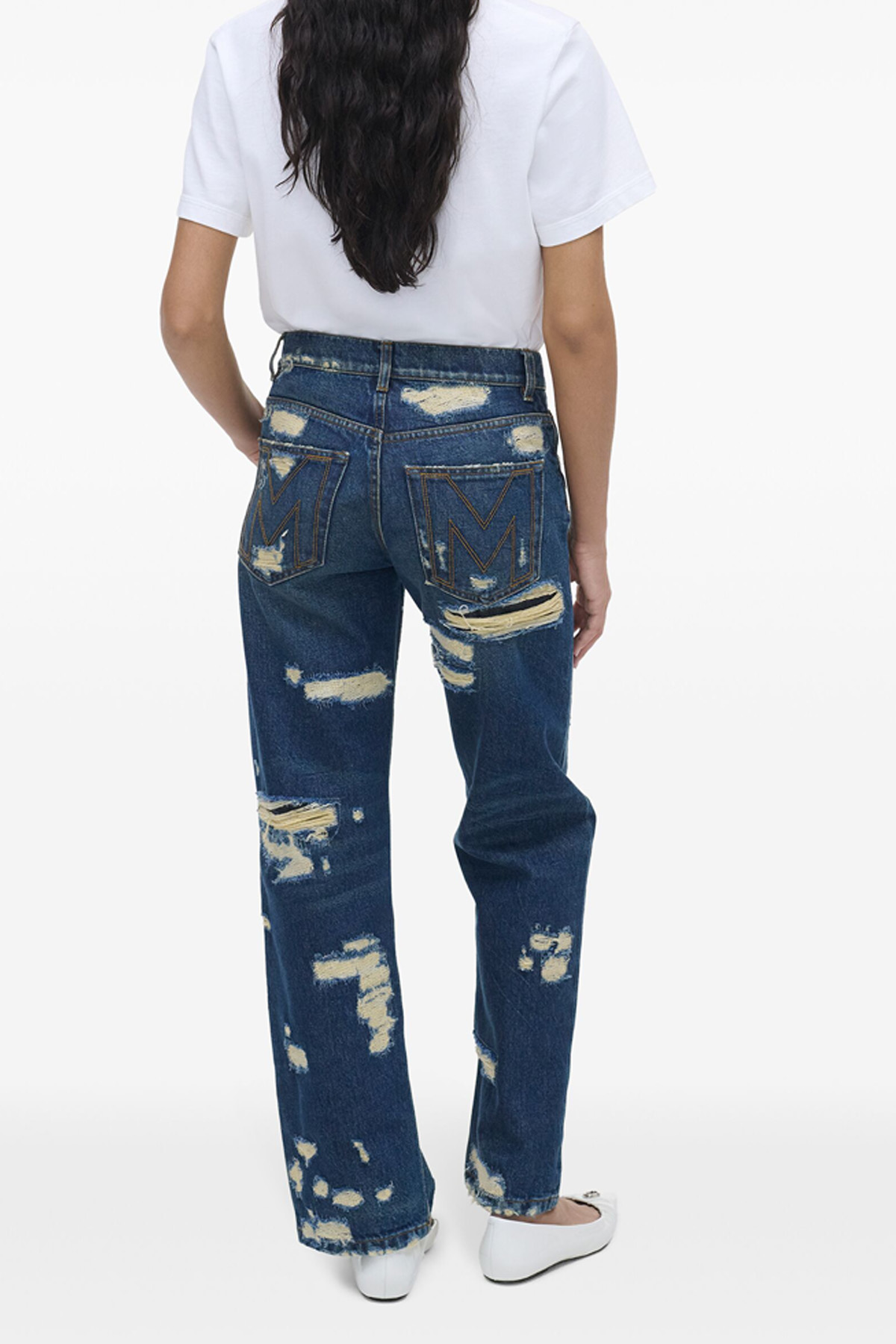 'The Rip And Repair Straight Jean' cotton denim jeans with all-over Rip and Repair effect, zip and button closure, five pockets with front metal logo, wide and straight leg.