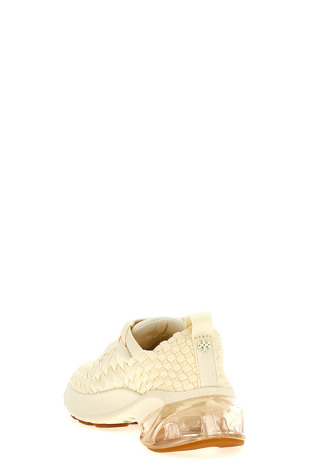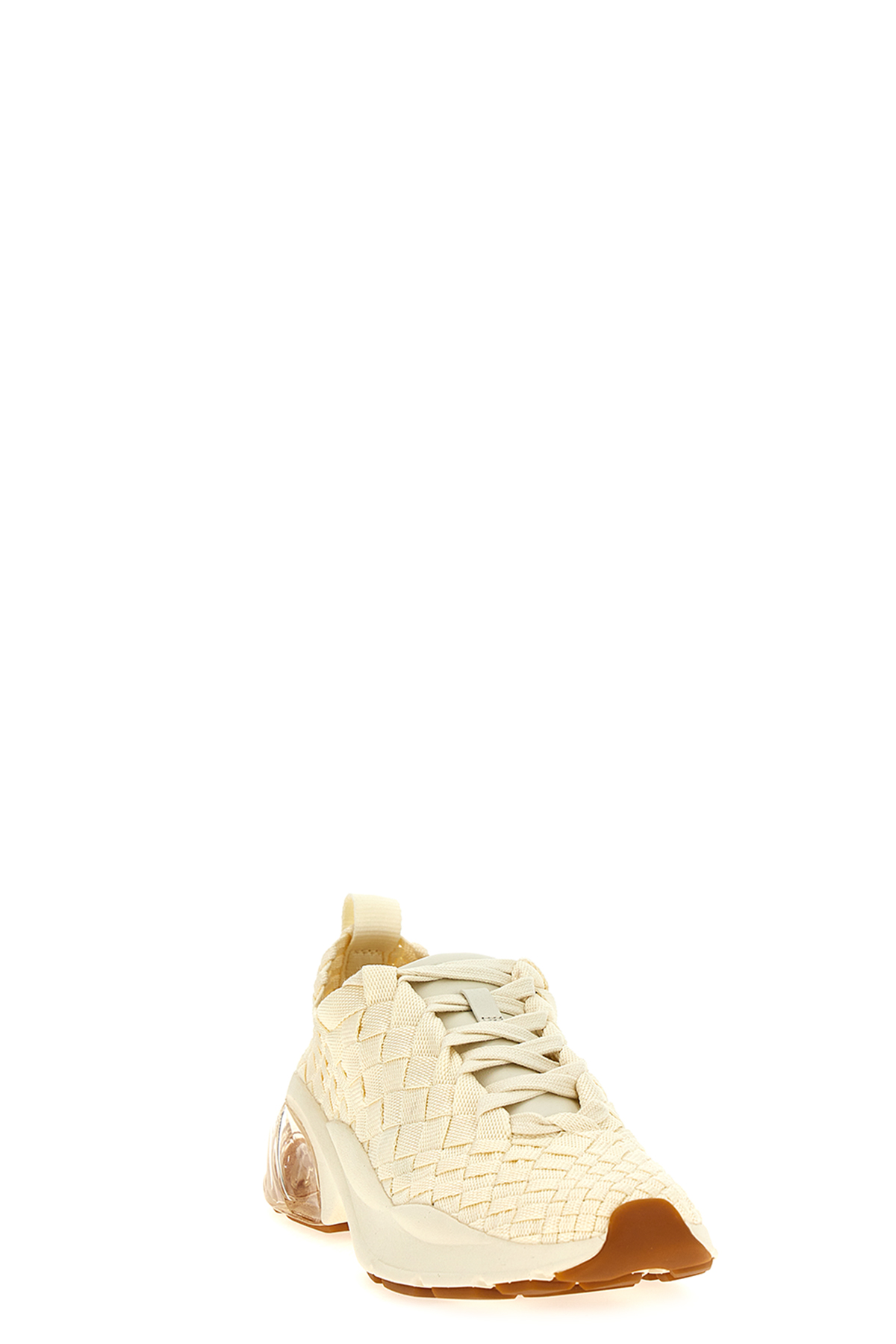 'Good Luck Woven Trainer' sneakers in hand-woven elastic webbing with leather details, lace-up closure, cushioned midsole, rubber sole.