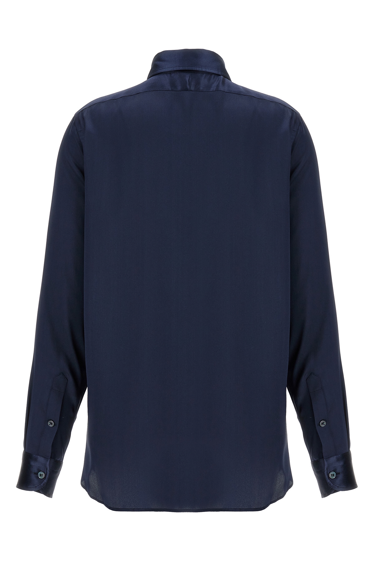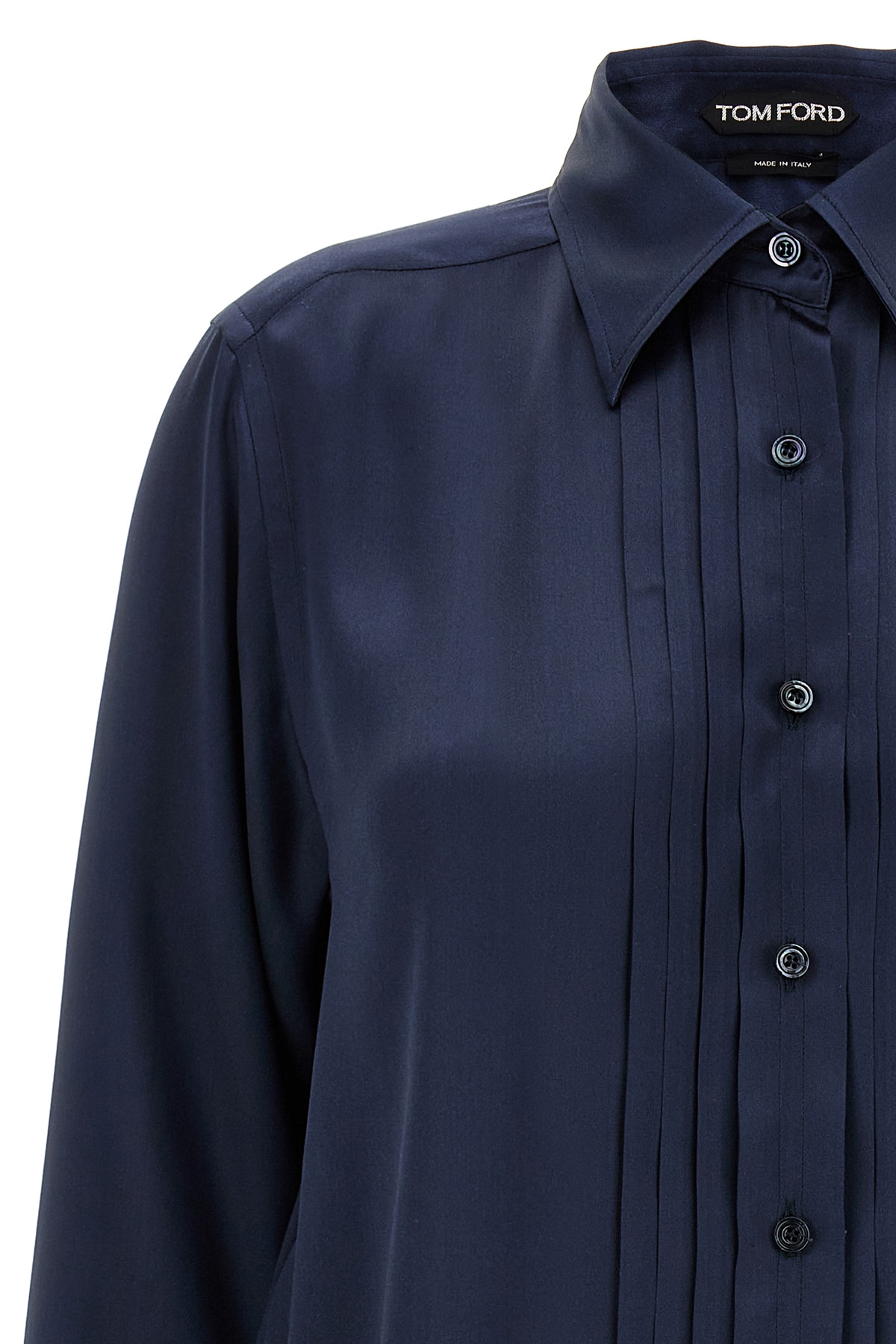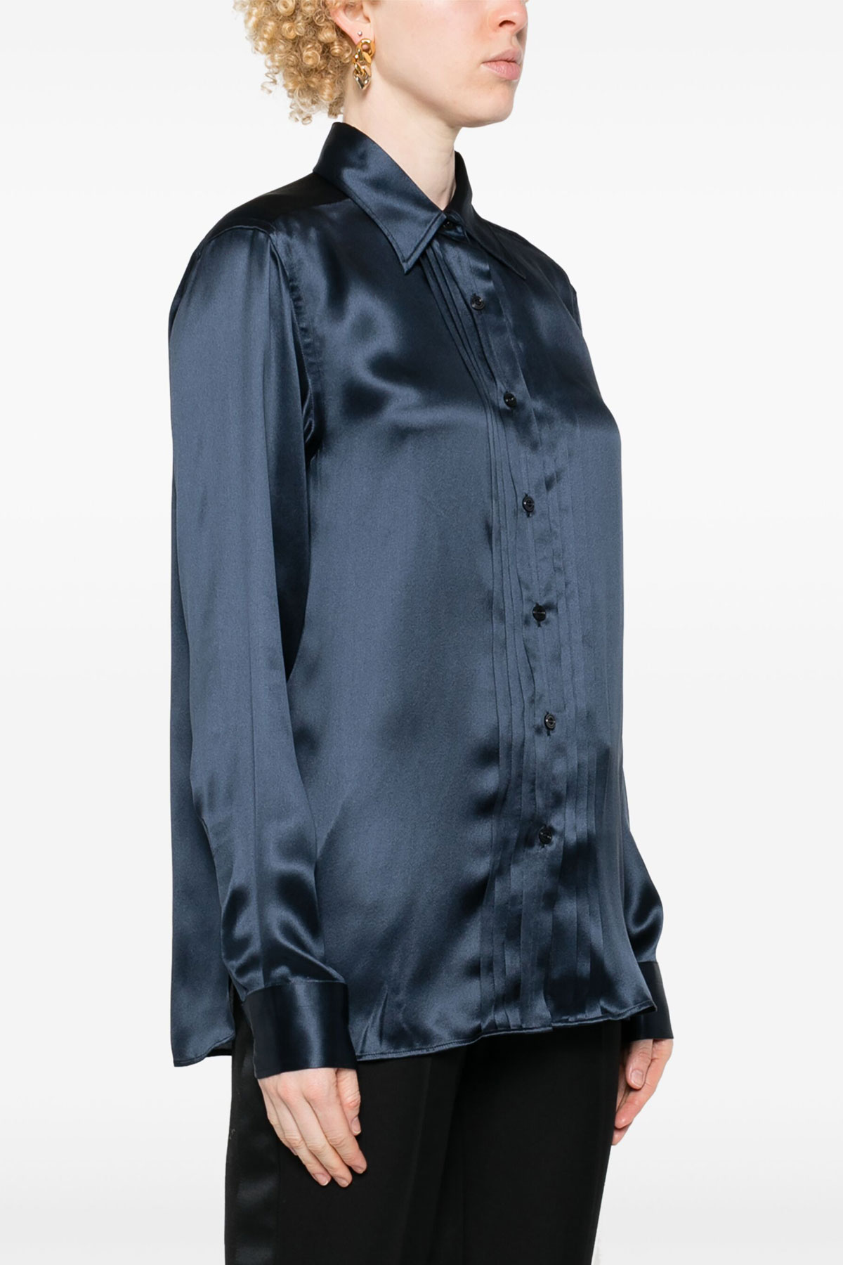 Silk shirt with pleated plastron, button closure, long cuffed sleeves.