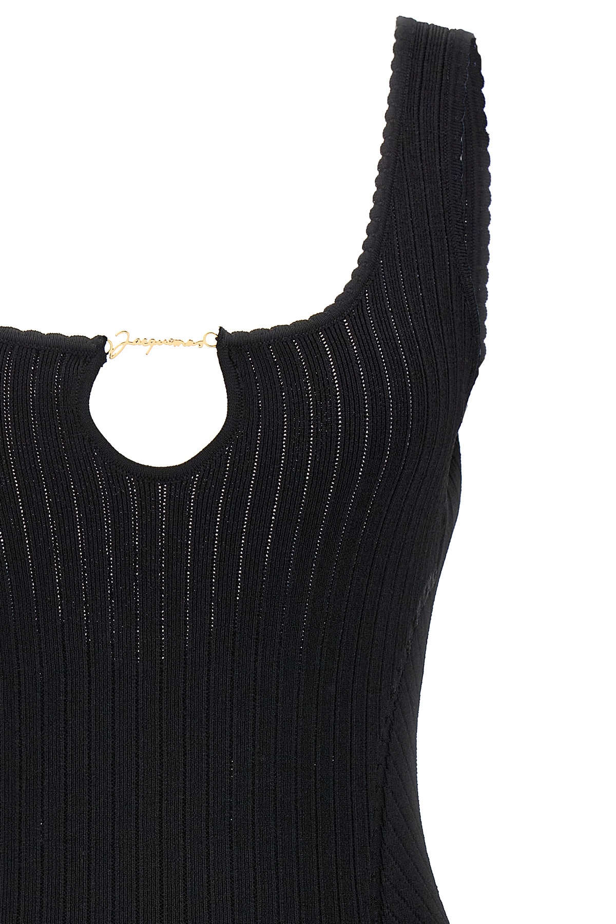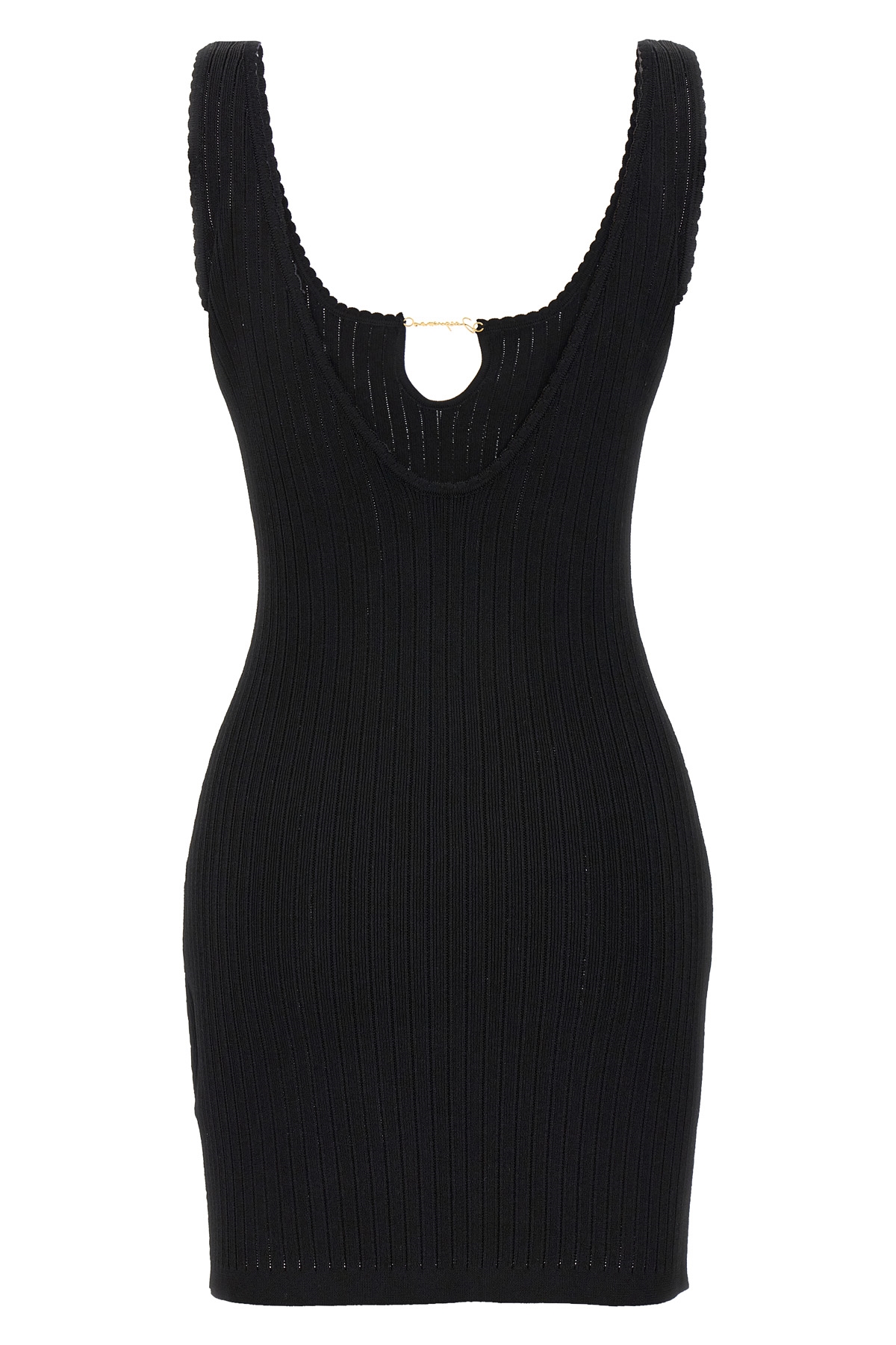 'La mini robe Sierra' dress in ribbed viscose blend with front cut-out detail with gold metal logo charm, sleeveless.