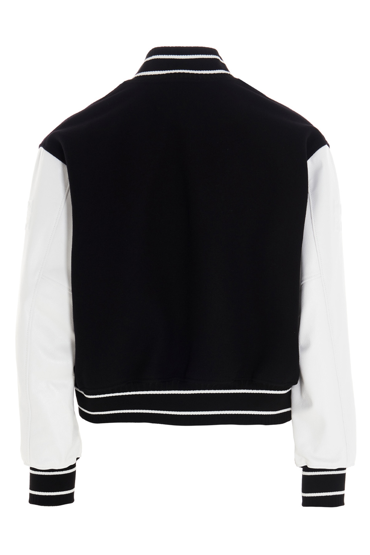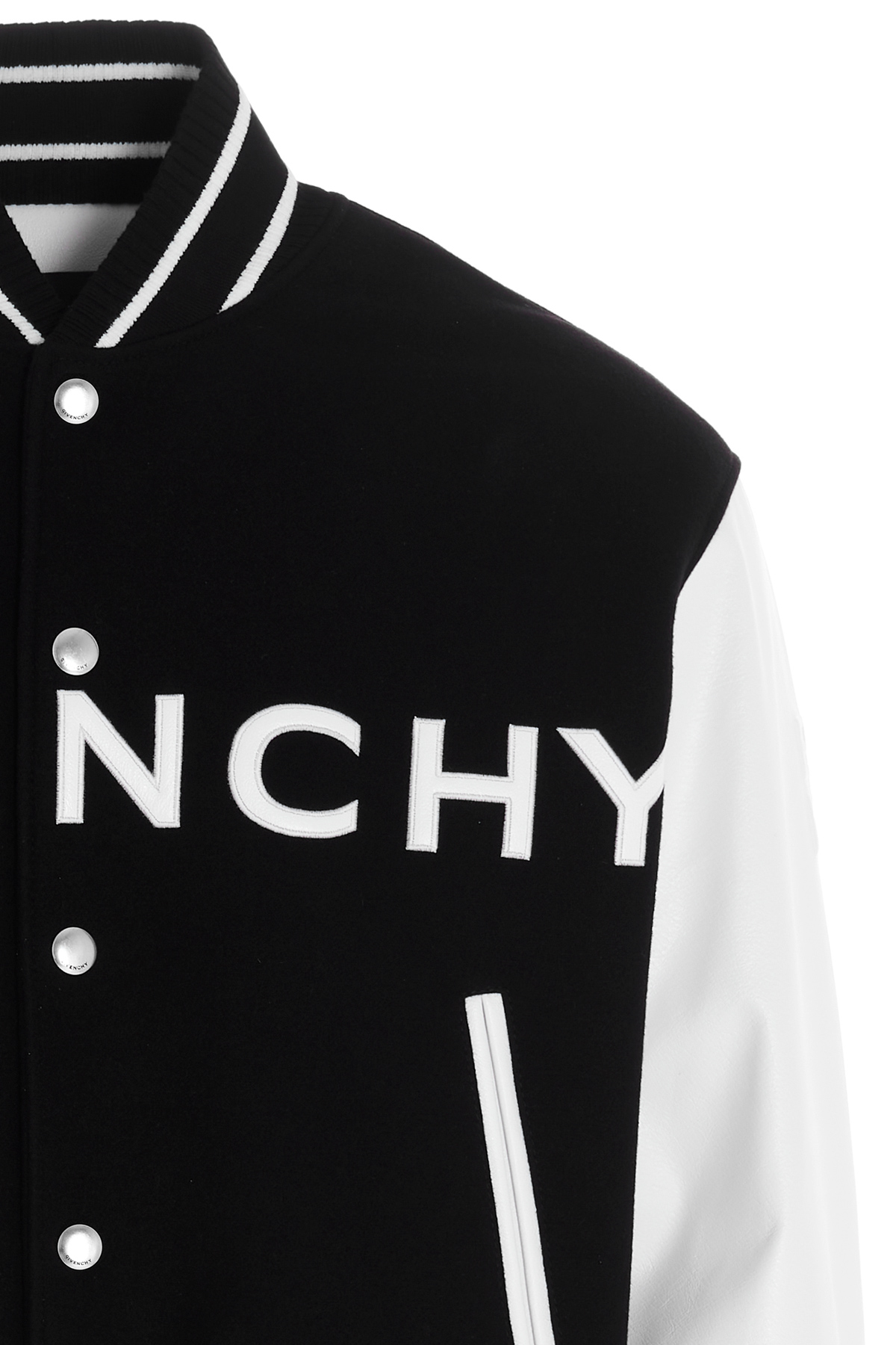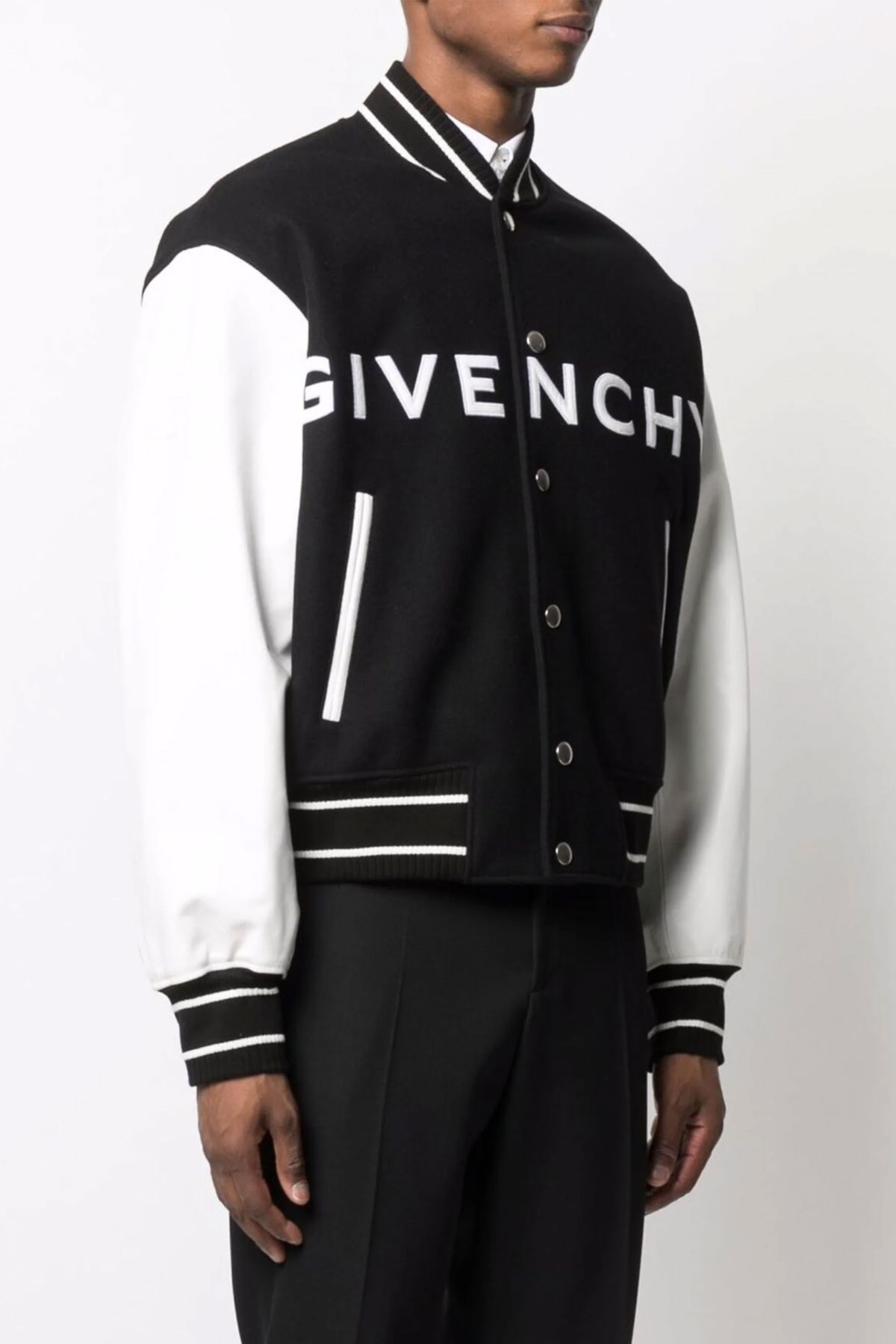 Givenchy wool and leather bomber jacket featuring a snap logo button fastening and embellished with contrasting leather logo details.