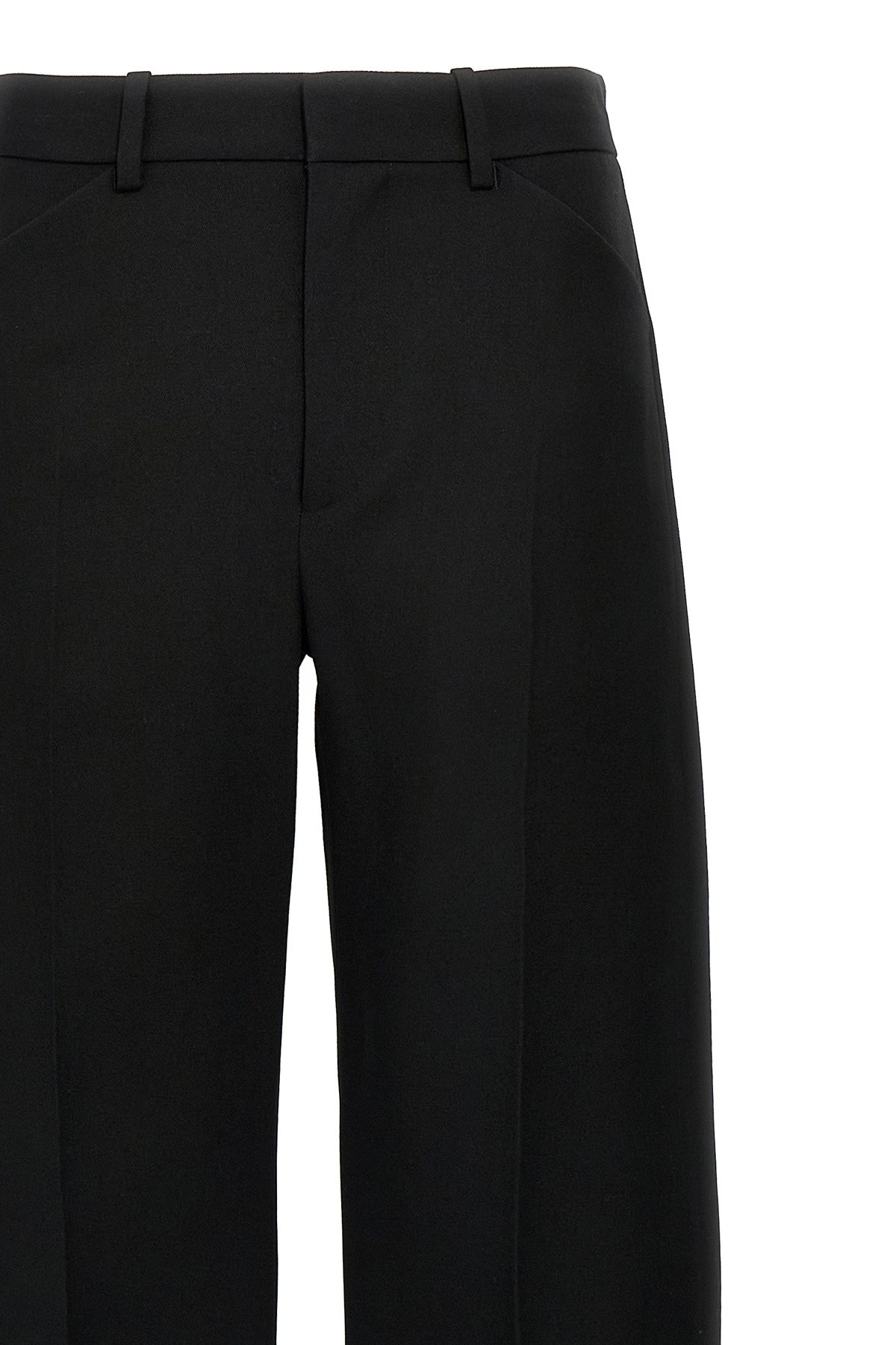 Wool pants, regular waist with arched leg, pockets, zip, hook and button closure.