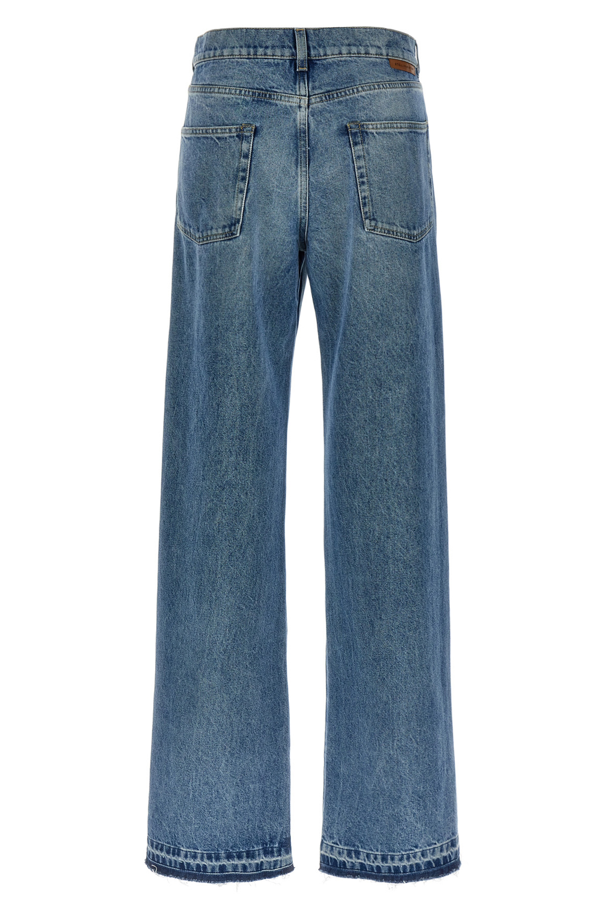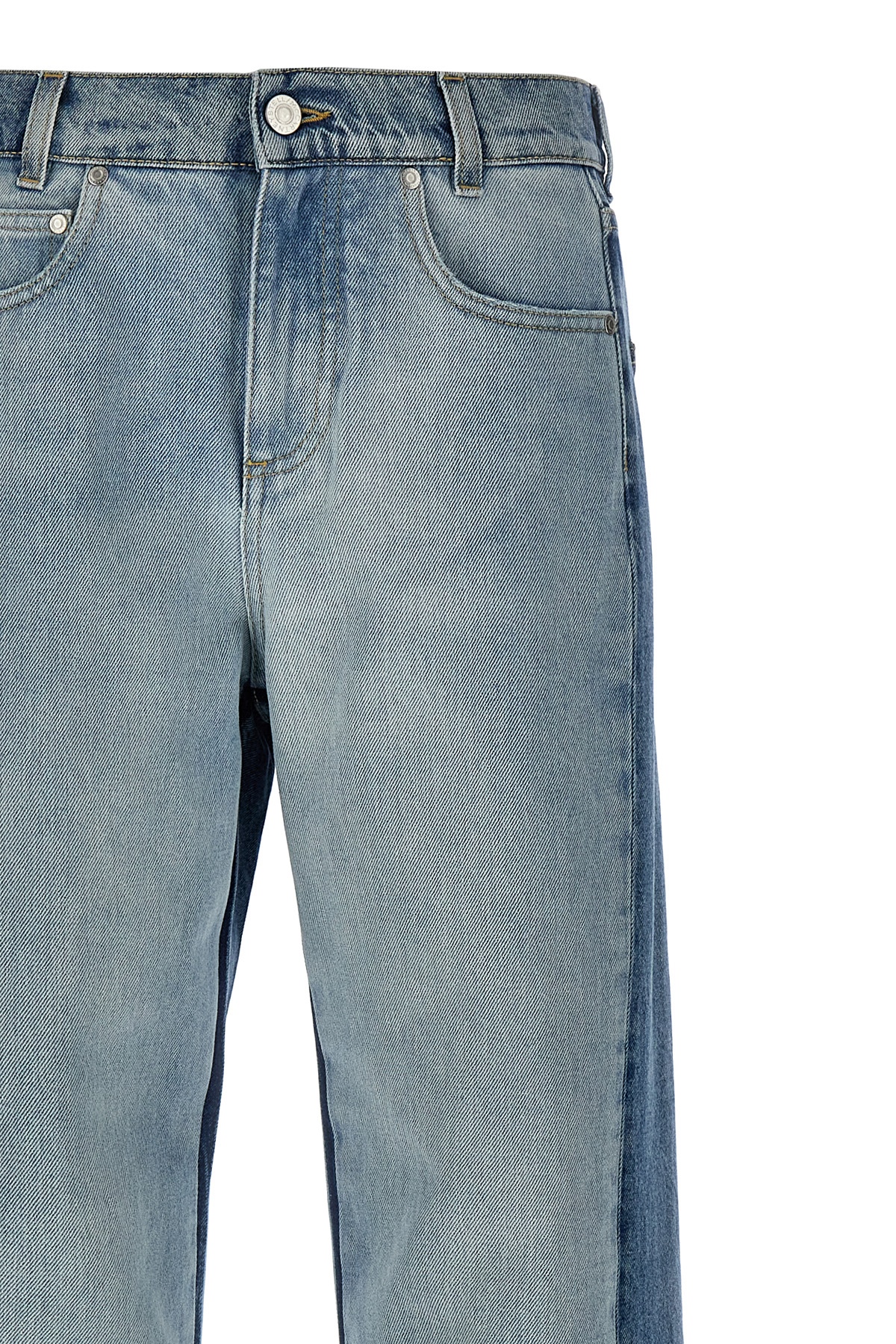 Two-tone layered cotton denim jeans with aged finish, zip and button closure, five pockets, high-waisted style with wide, straight leg.
