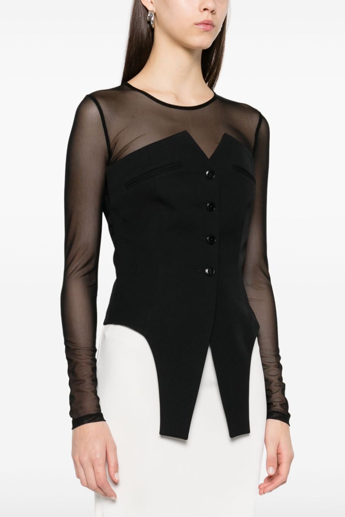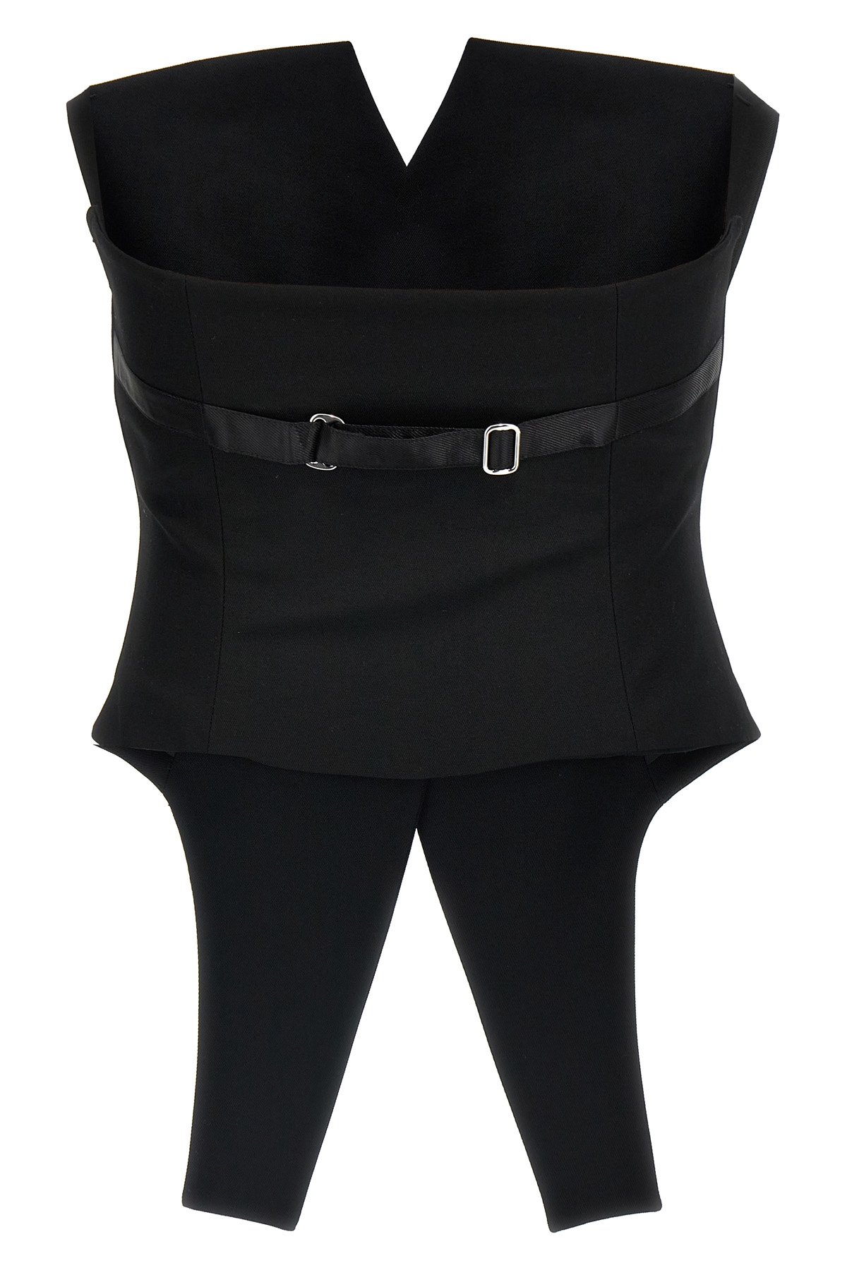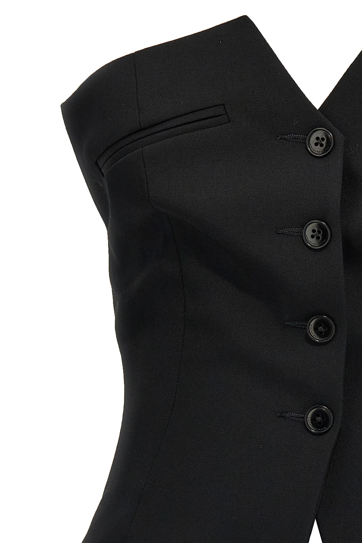 Deconstructed wool vest with bodice, partial button closure, adjustable back strap, off-the-shoulder style.