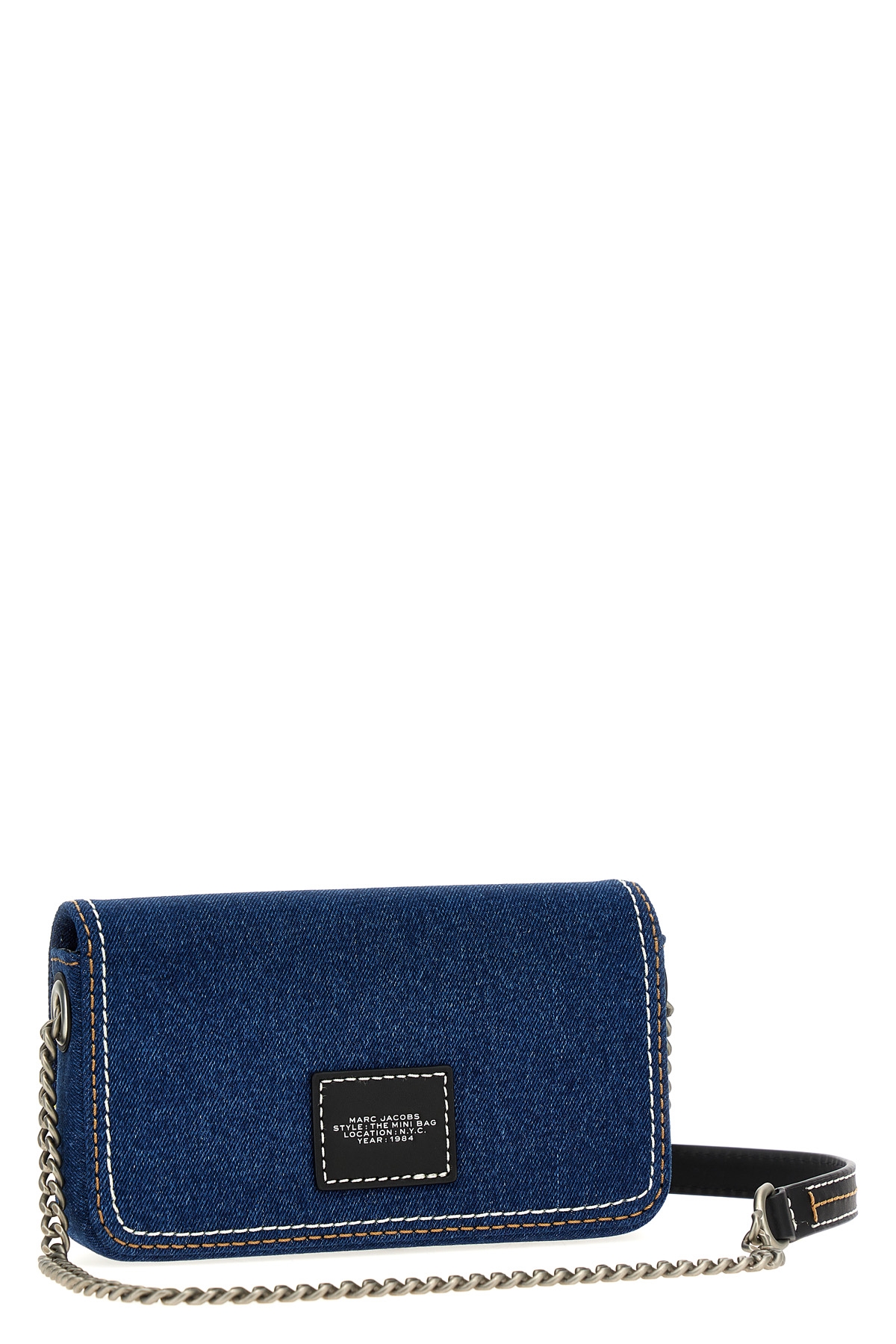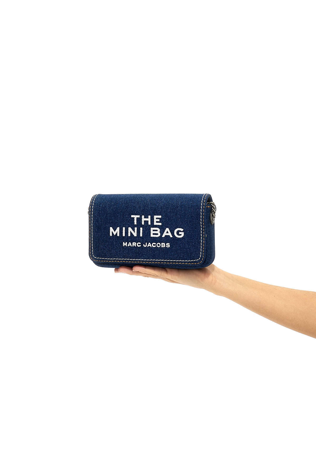 'The Denim Chain Mini' cotton denim crossbody bag, magnetic flap closure with logo embroidery, contrast stitching detail, chain shoulder strap.