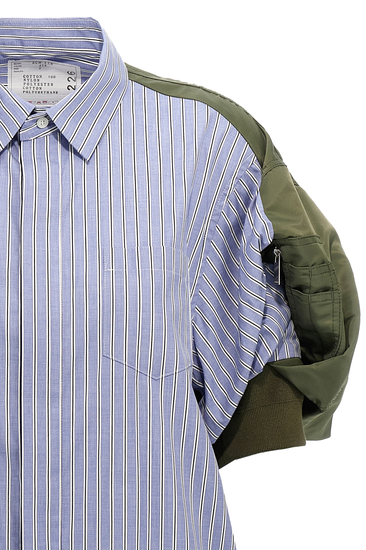 Mini dress in cotton poplin with nylon inserts, chemisier model, button closure, pockets, short sleeves with elastic cuffs.