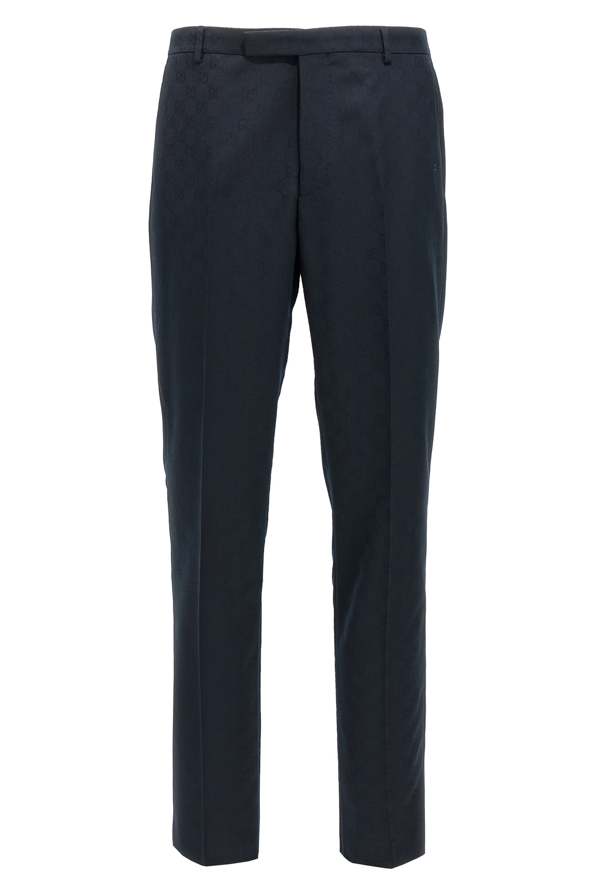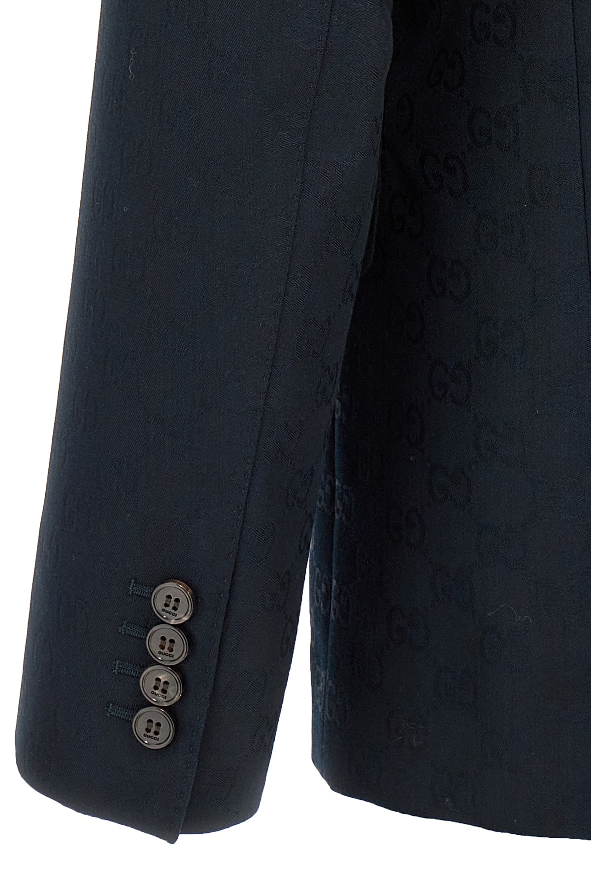 GG wool jacquard dress consisting of single-breasted blazer with covered button closure, tooth lapels, front flap pockets, back split, lining all over the garment, padded shoulders and straight leg pants with belt loops, stretched pleat, pockets, hook and zip closure.