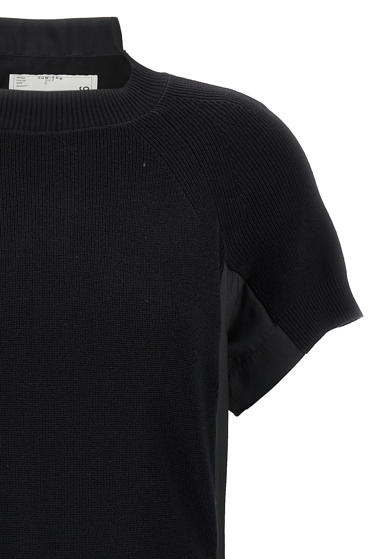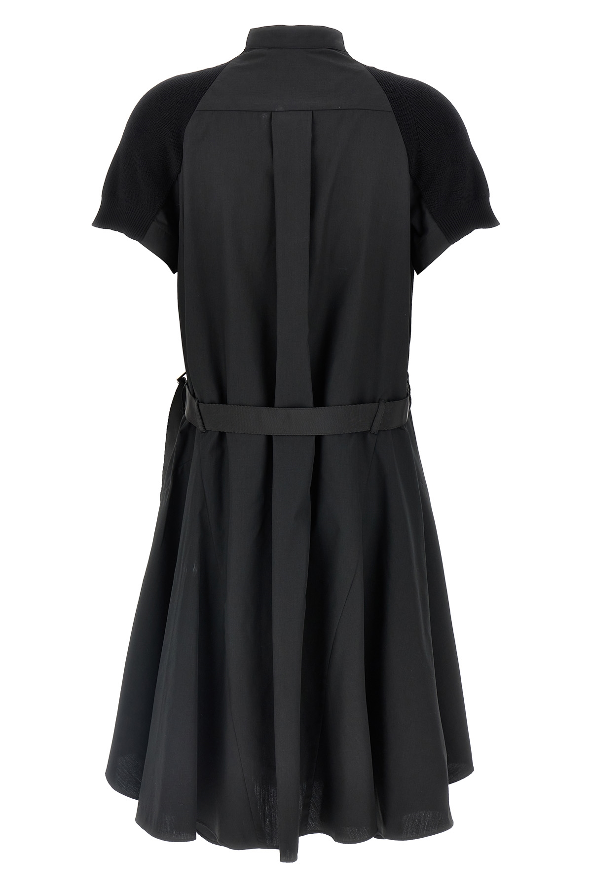 Two-material dress in cotton poplin, crew neck, short sleeves, full skirt with buttons, adjustable belt at the waist.