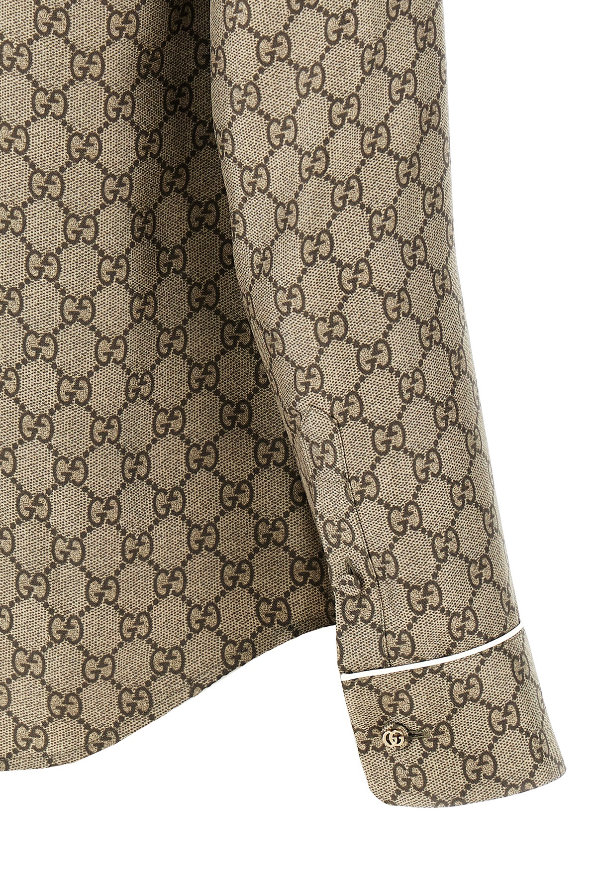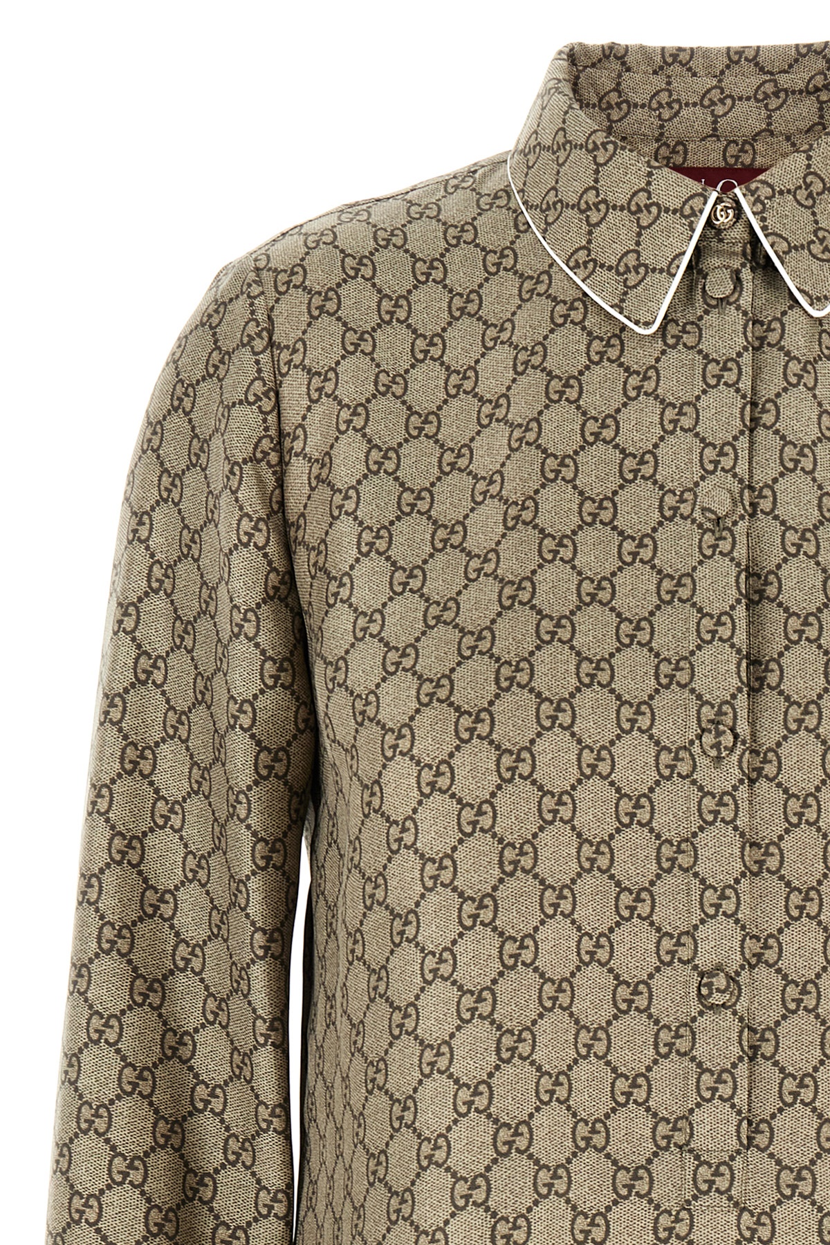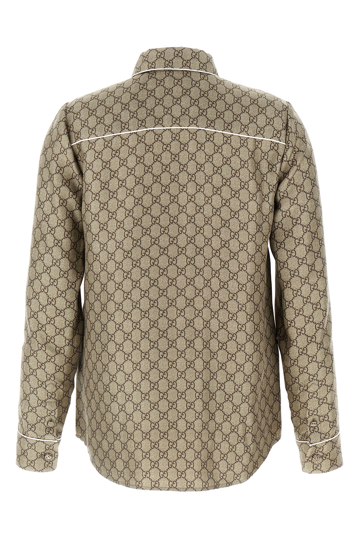 GG all-over silk twill blouse with contrast crepe de chine trim, collar and buttons, long cuffed sleeves.