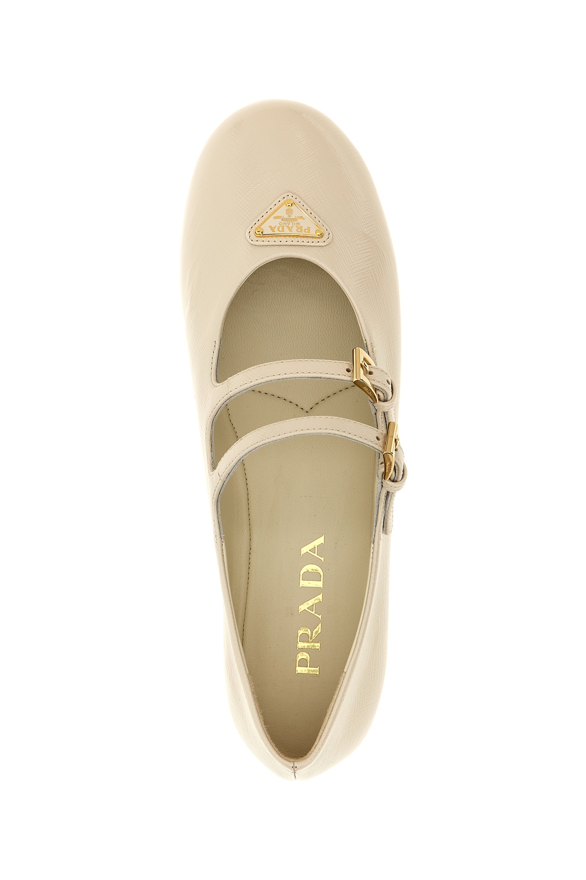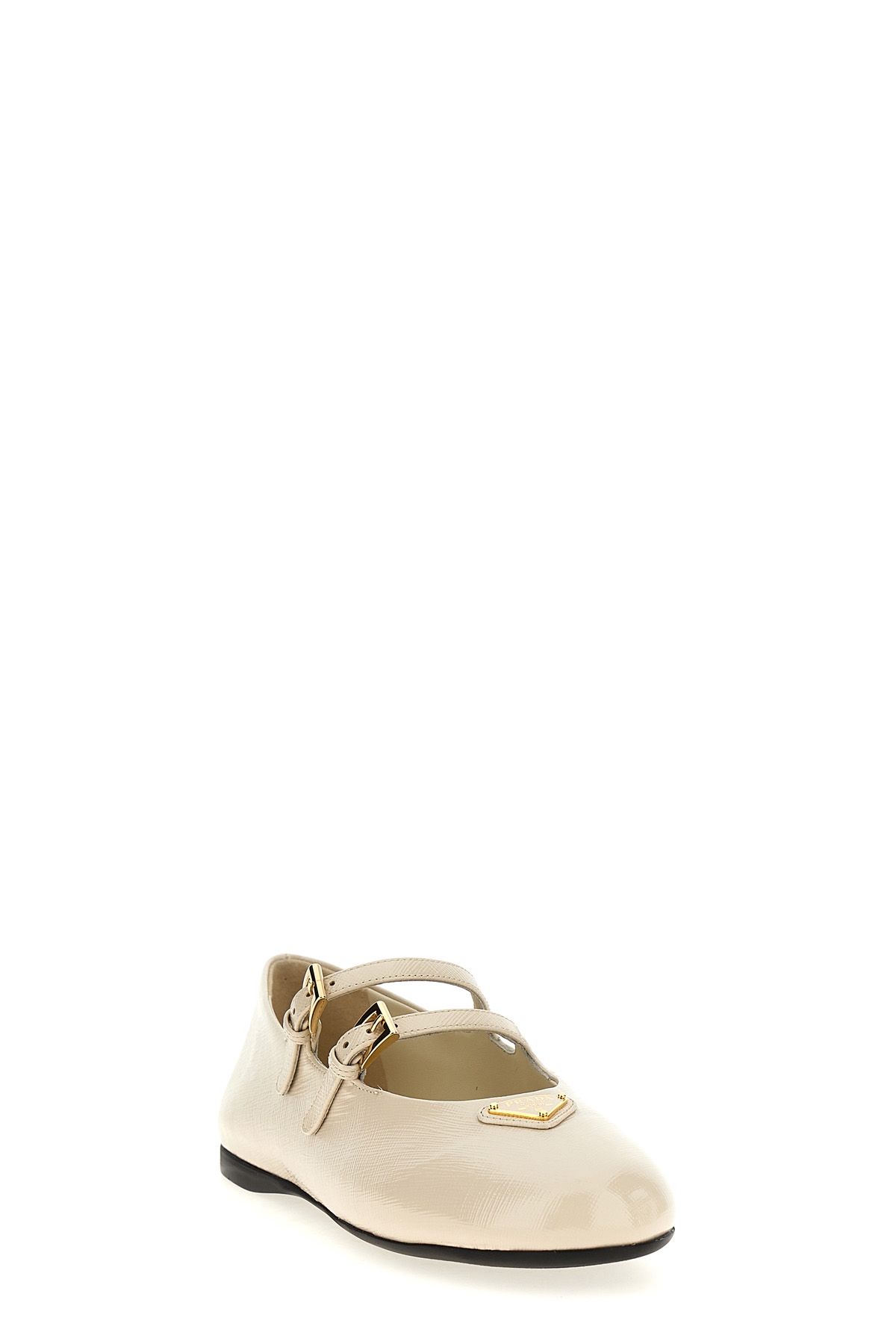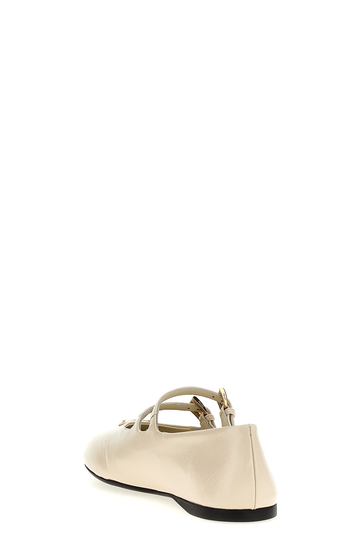Polished Saffiano leather ballet flats with double adjustable strap, front enameled metal triangle logo, rubber sole.