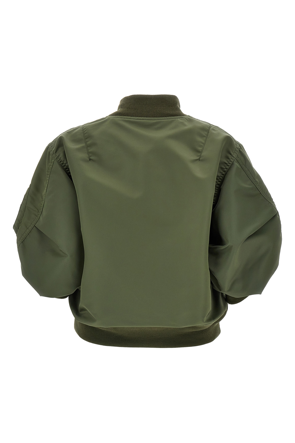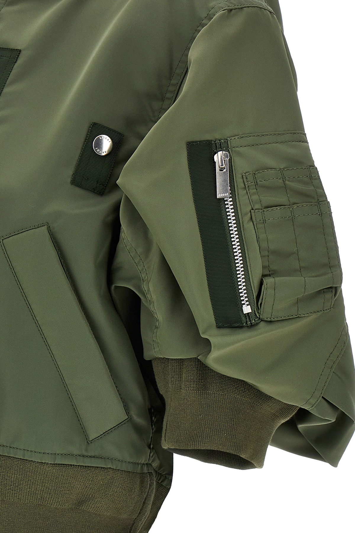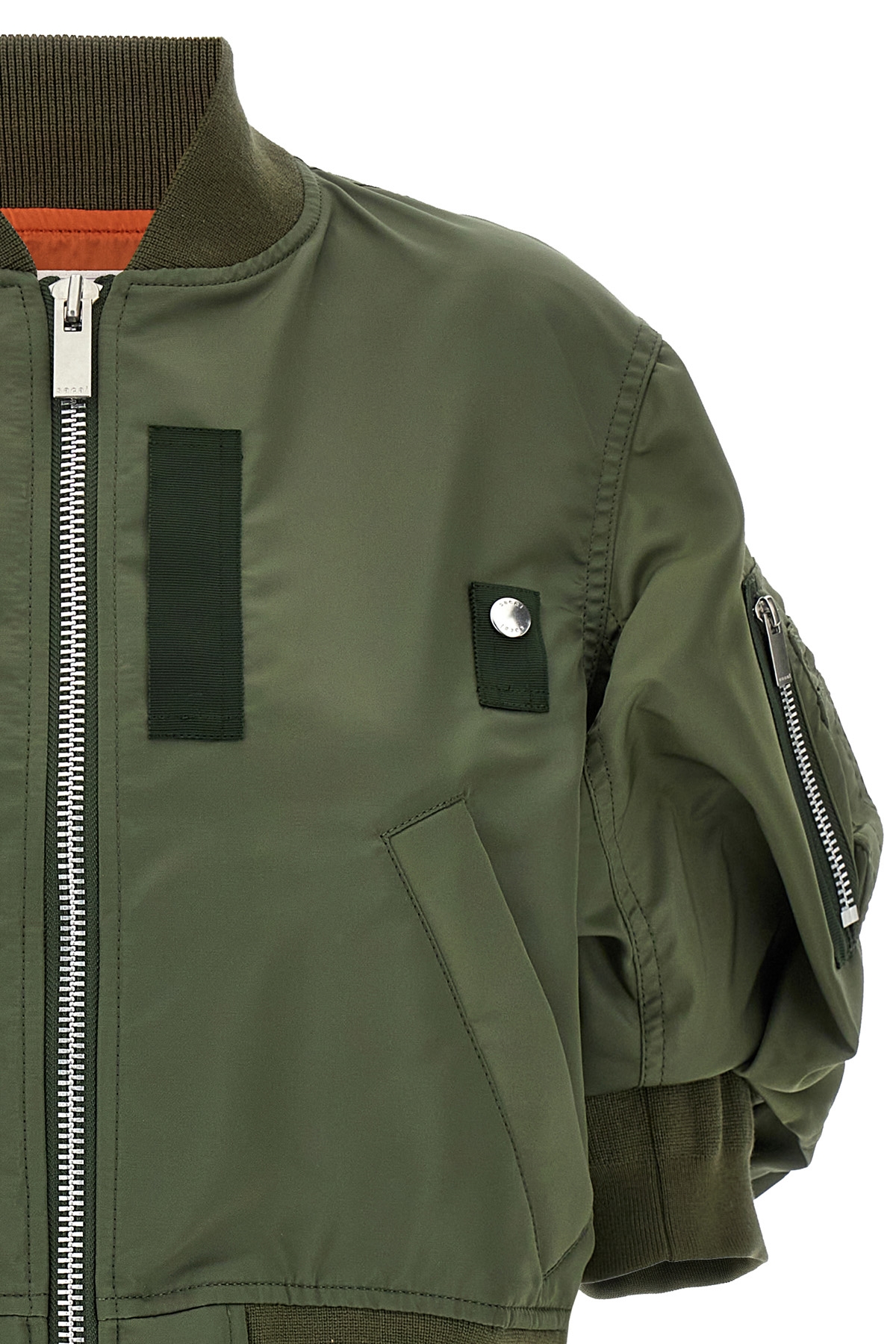 Nylon bomber jacket, 3/4 sleeves, knit band detail at end of neck sleeve and on bottom of garment, zipper closure, pockets.