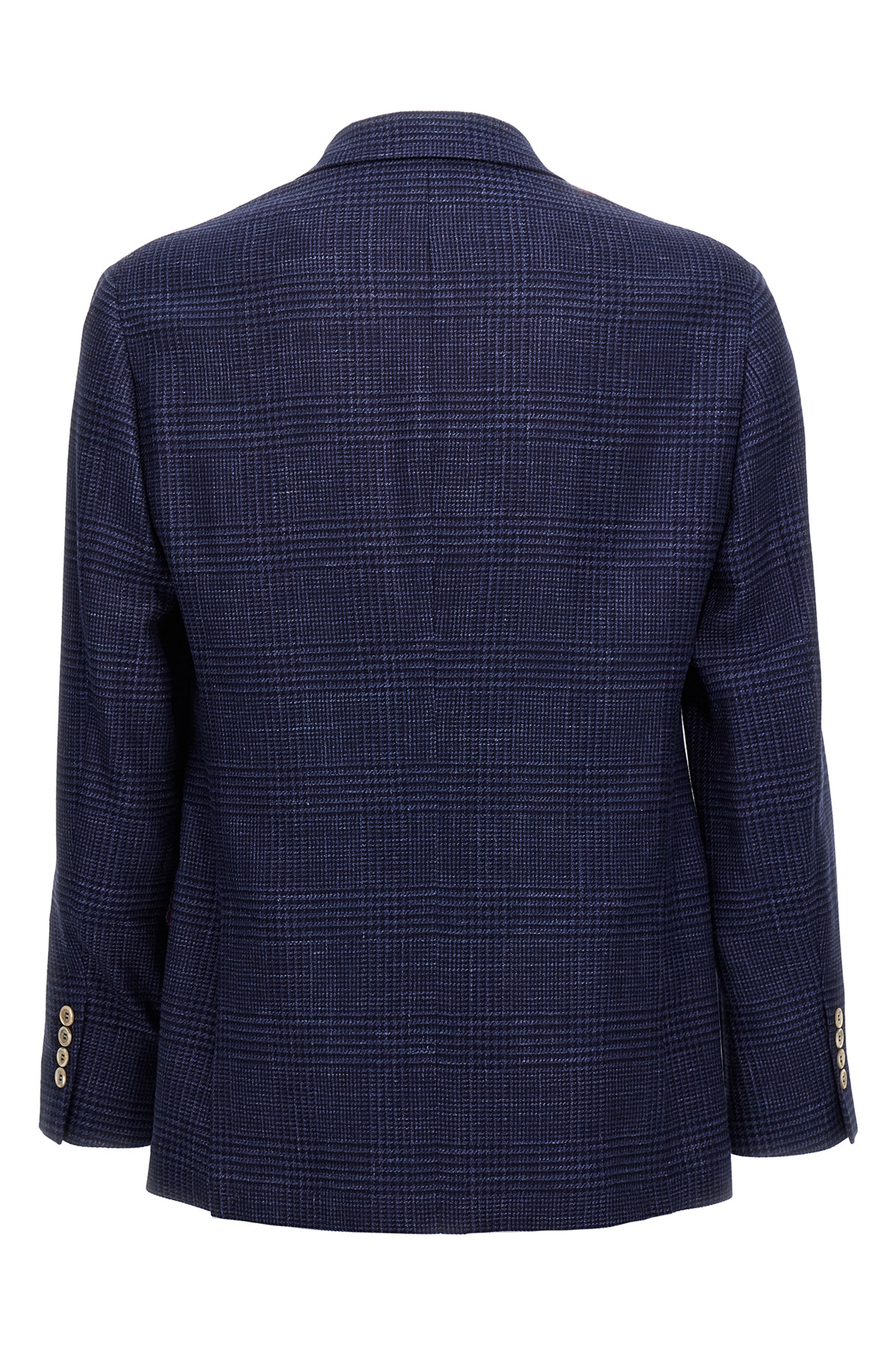 Check wool blend single-breasted blazer with button closure, pockets, long sleeves, back vents.