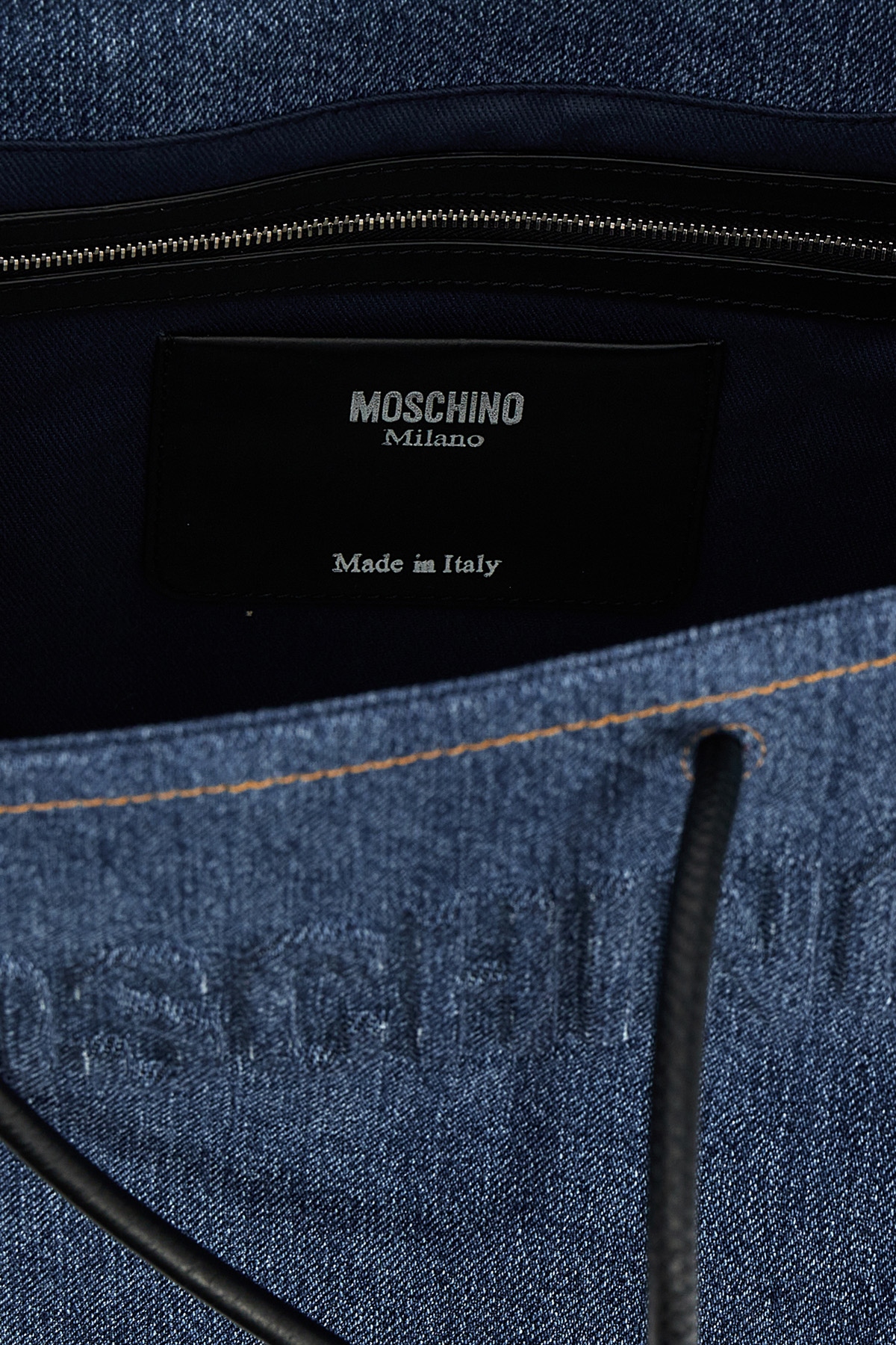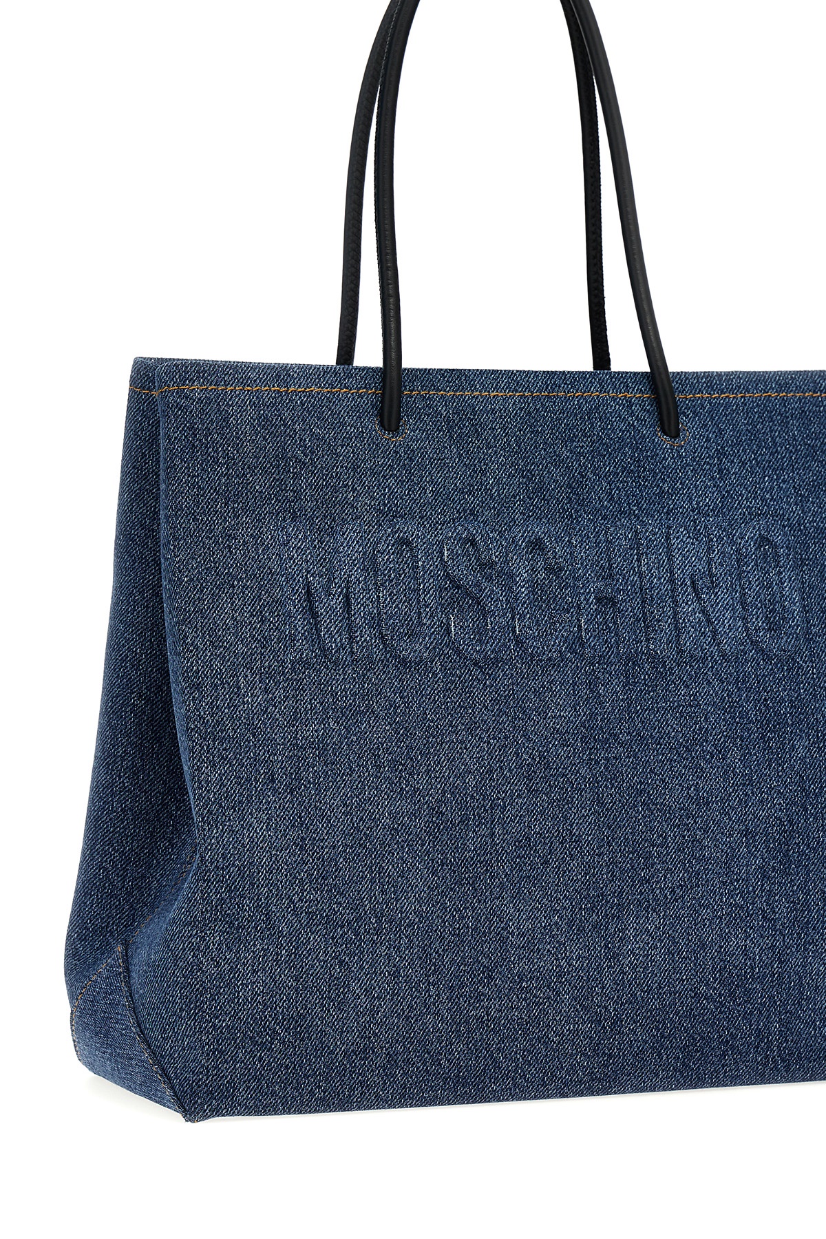Cotton denim shopping bag with double leather handle, contrast stitching, embossed tone-on-tone logo on the front. Adjustable with side snap buttons, adjustable and removable shoulder strap.
