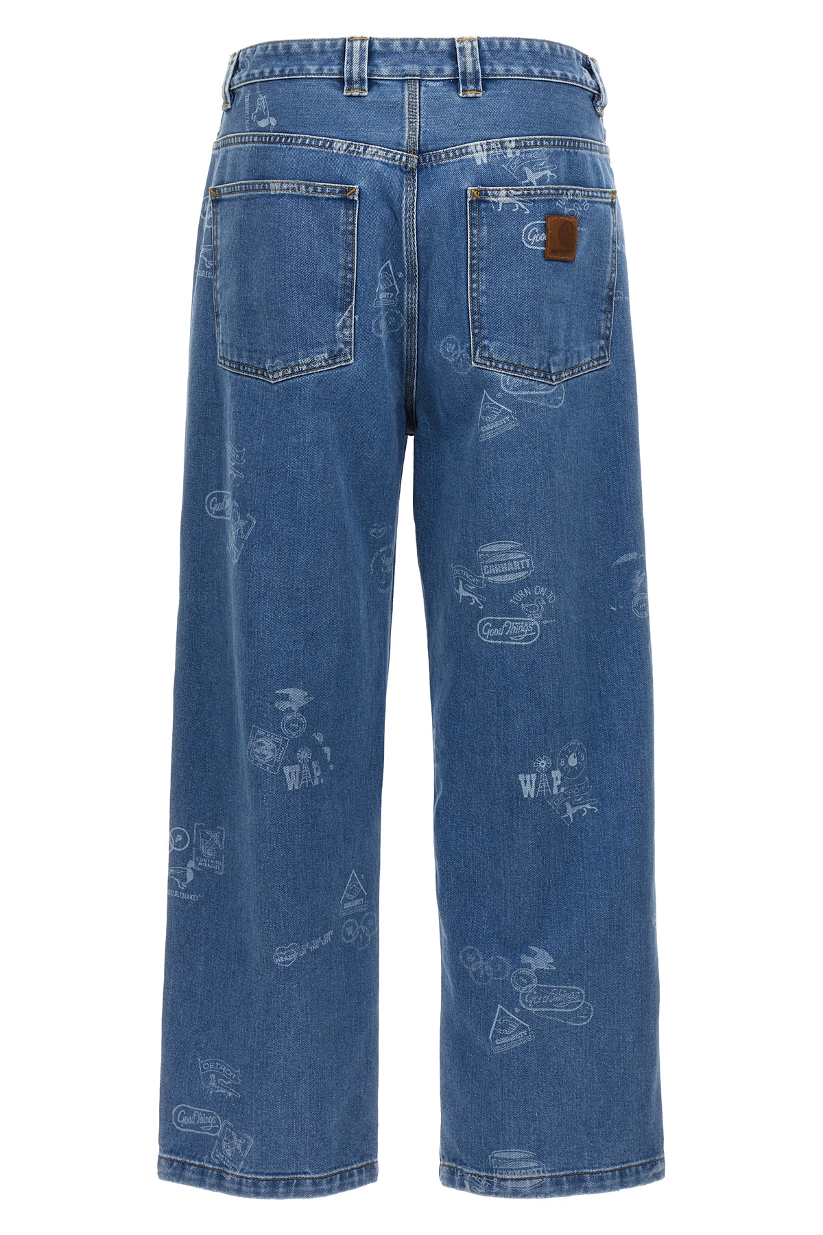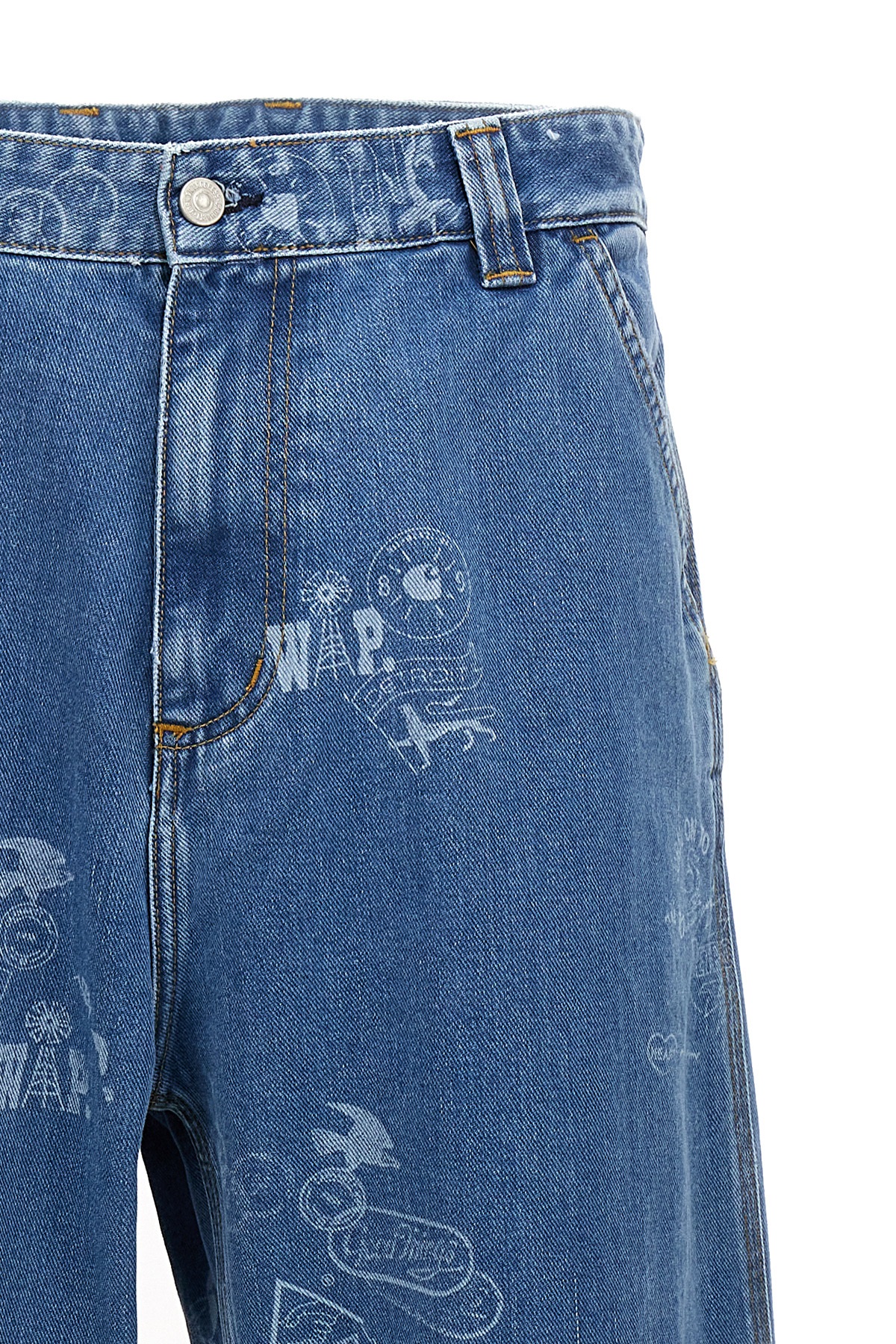 'Stamp' cotton denim jeans with all-over print, zip and button closure, five pockets, leather logo patch at the back.