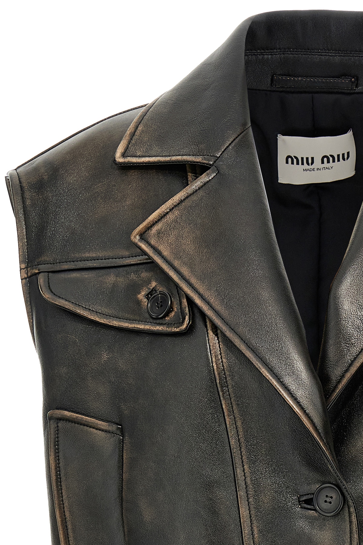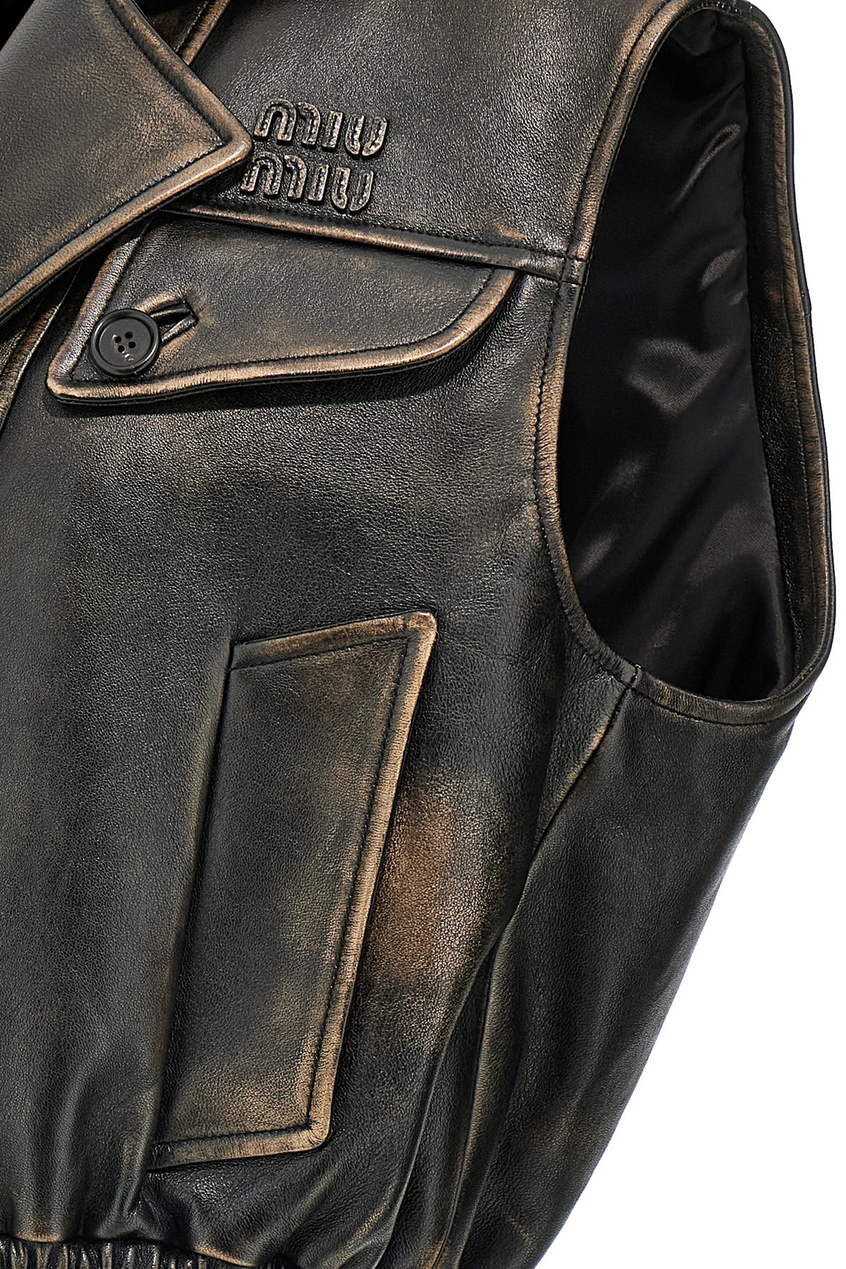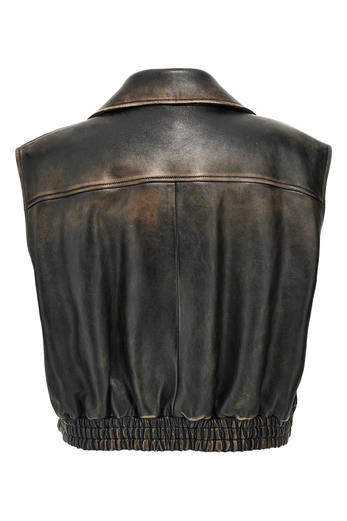 Lightly padded vintage-effect nappa leather vest, front logo patch, pockets, button closure, elastic waistband.