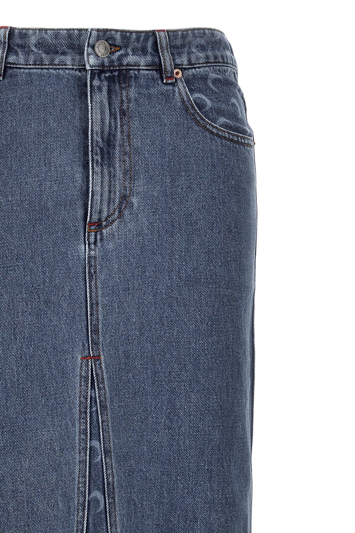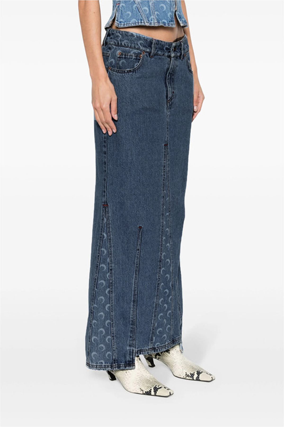 'Moon Laser' cotton denim skirt with logo print inserts, zip and button closure, five pockets, leather logo label at the back, back split.