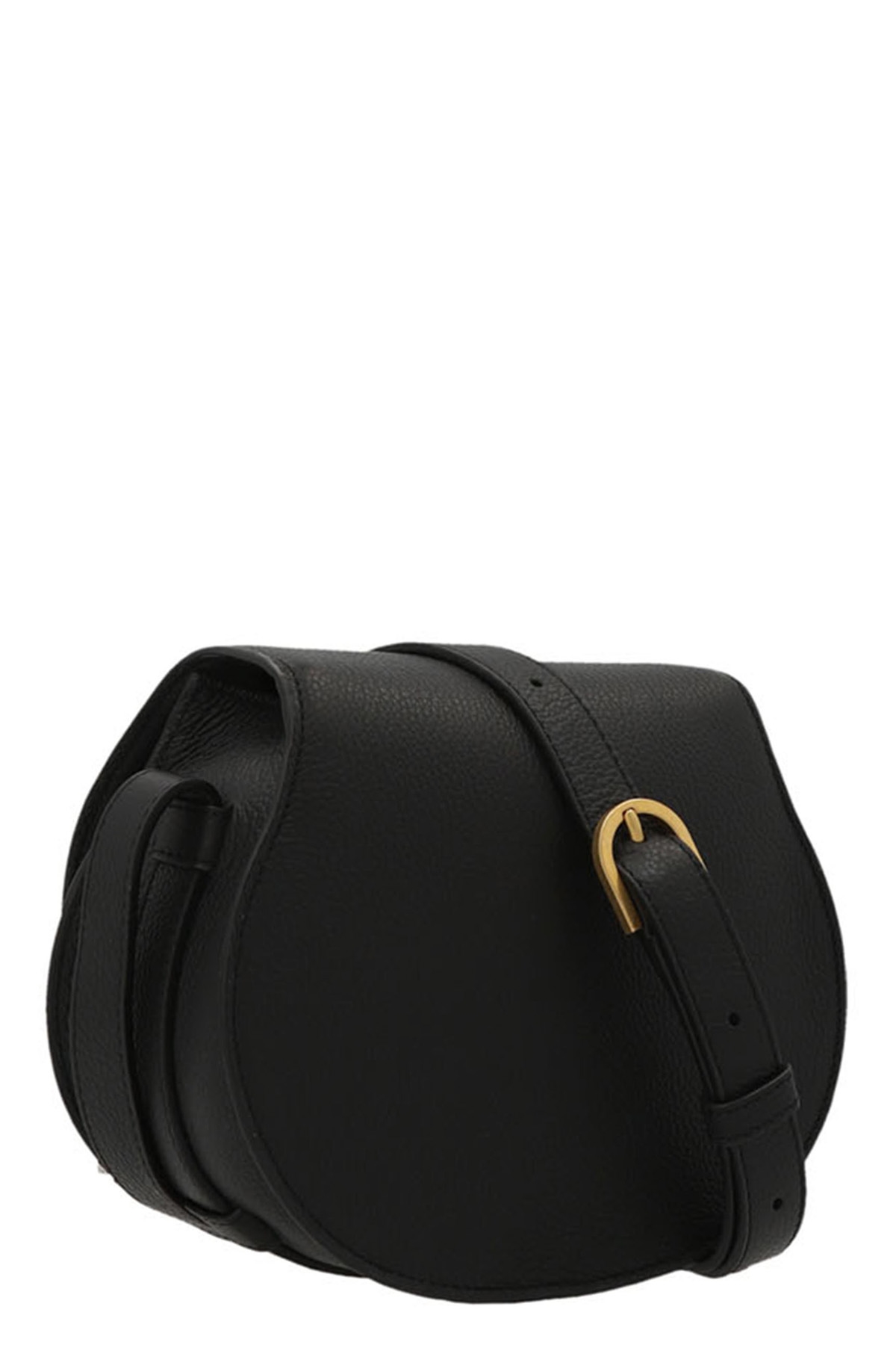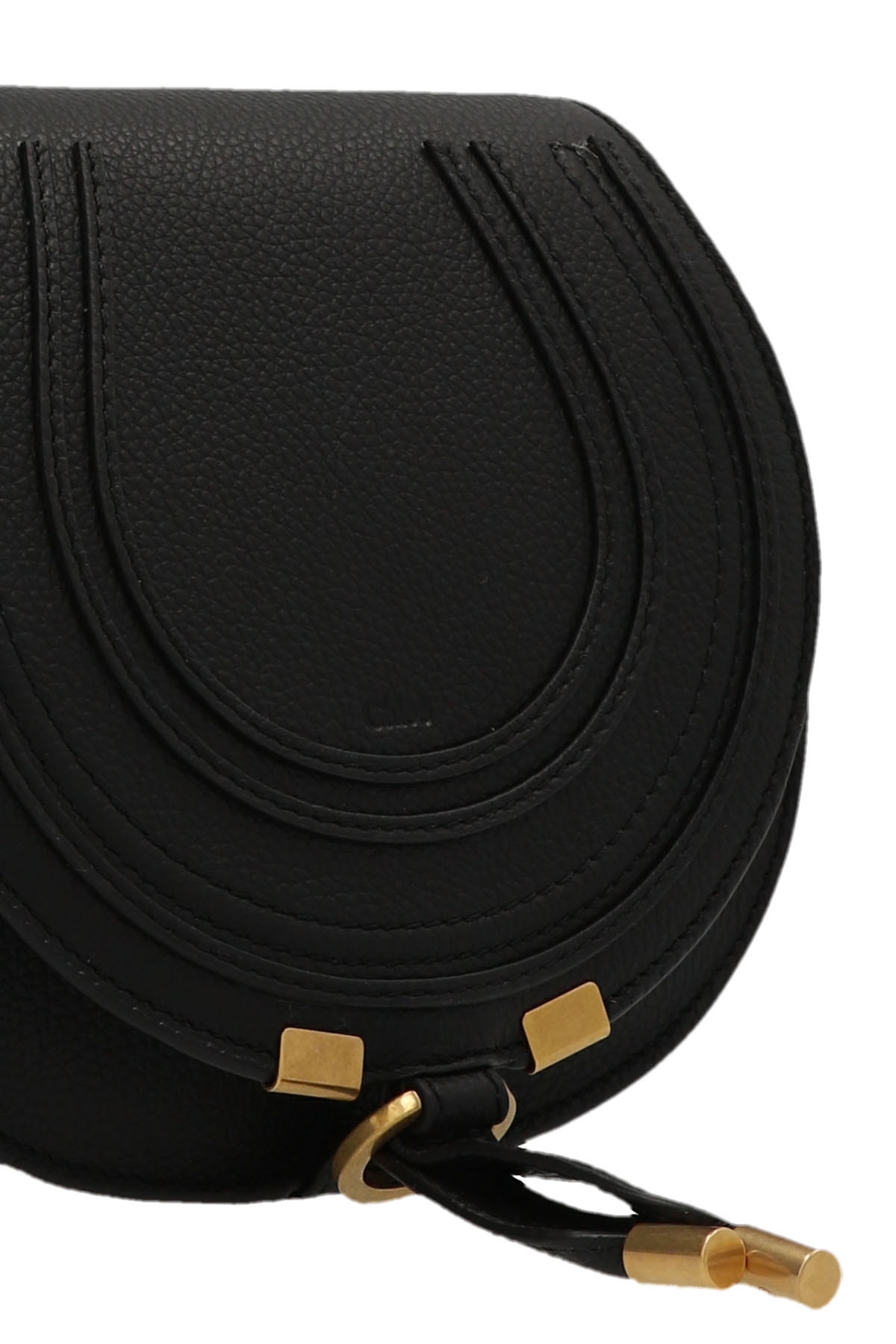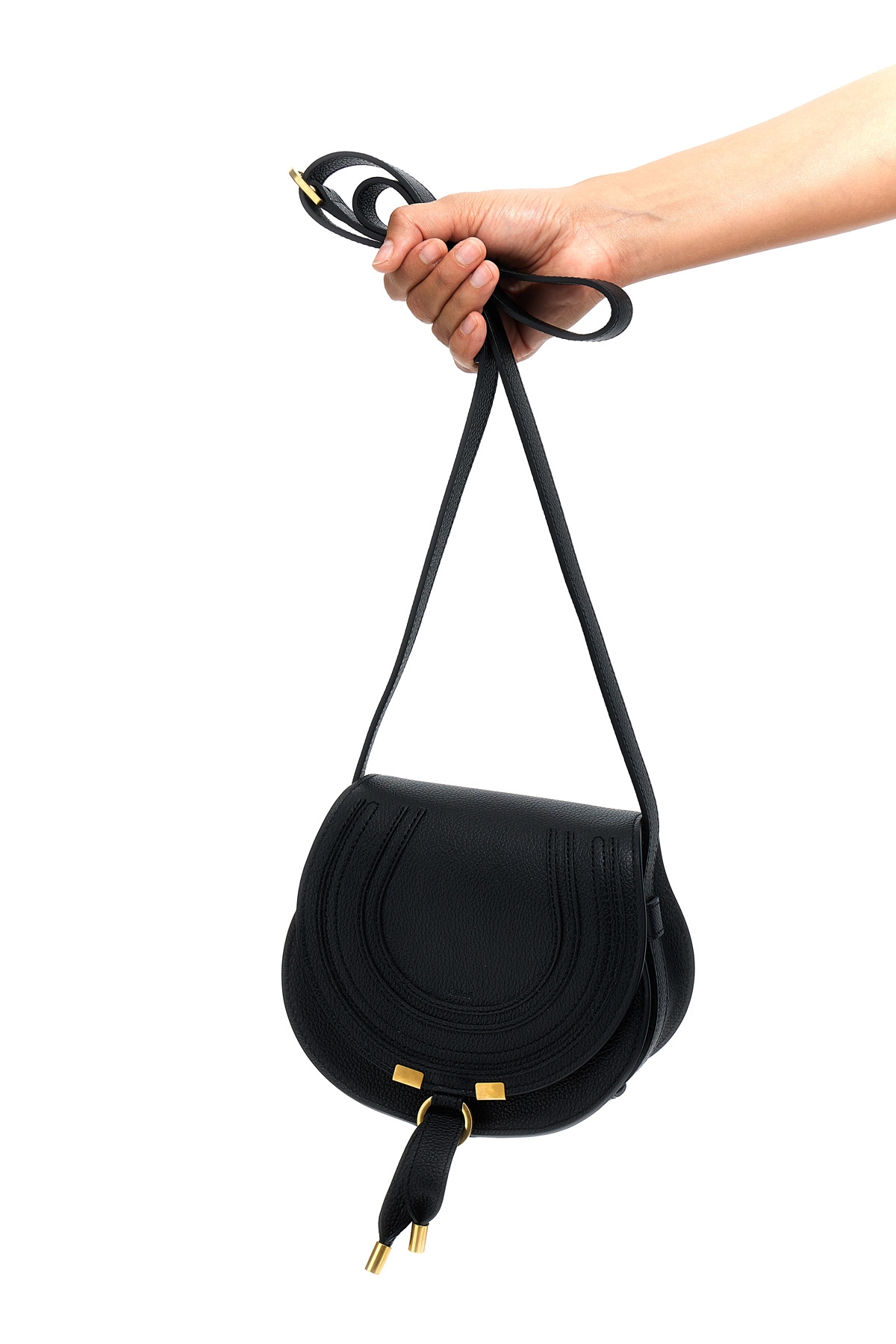 'Saddle Small Marcie' crossbody bag in grenade calf leather with a large compartment, open front pocket, interior flat card pocket, adjustable leather shoulder strap with square buckle, antique gold finish, and cotton interior. This small bag is made of semi-aniline leather. The tanning process gives a particular character to the leather, with wrinkles and discolorations that are added to the light and transparent aniline finish.