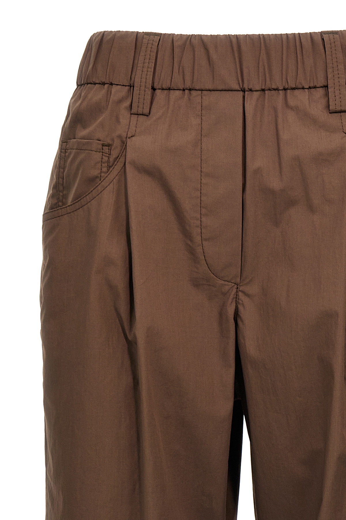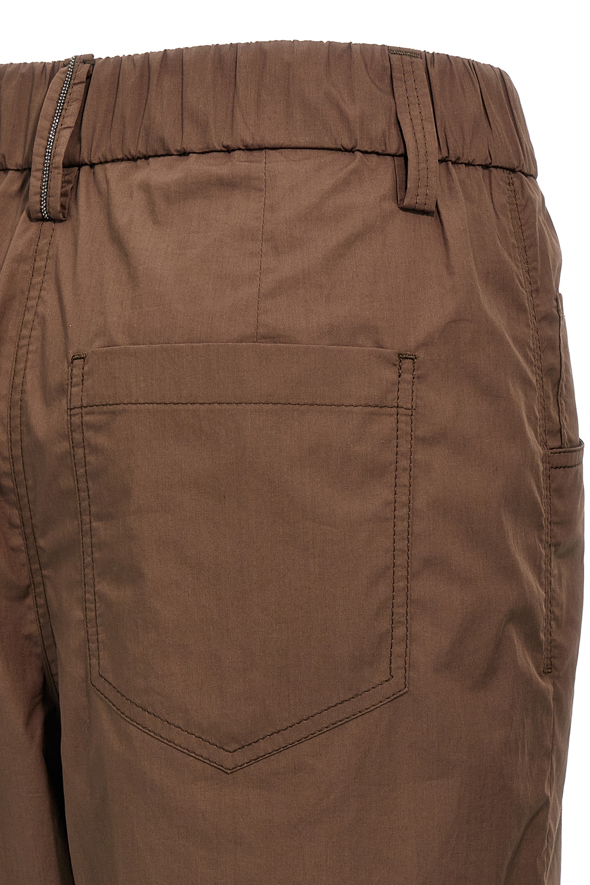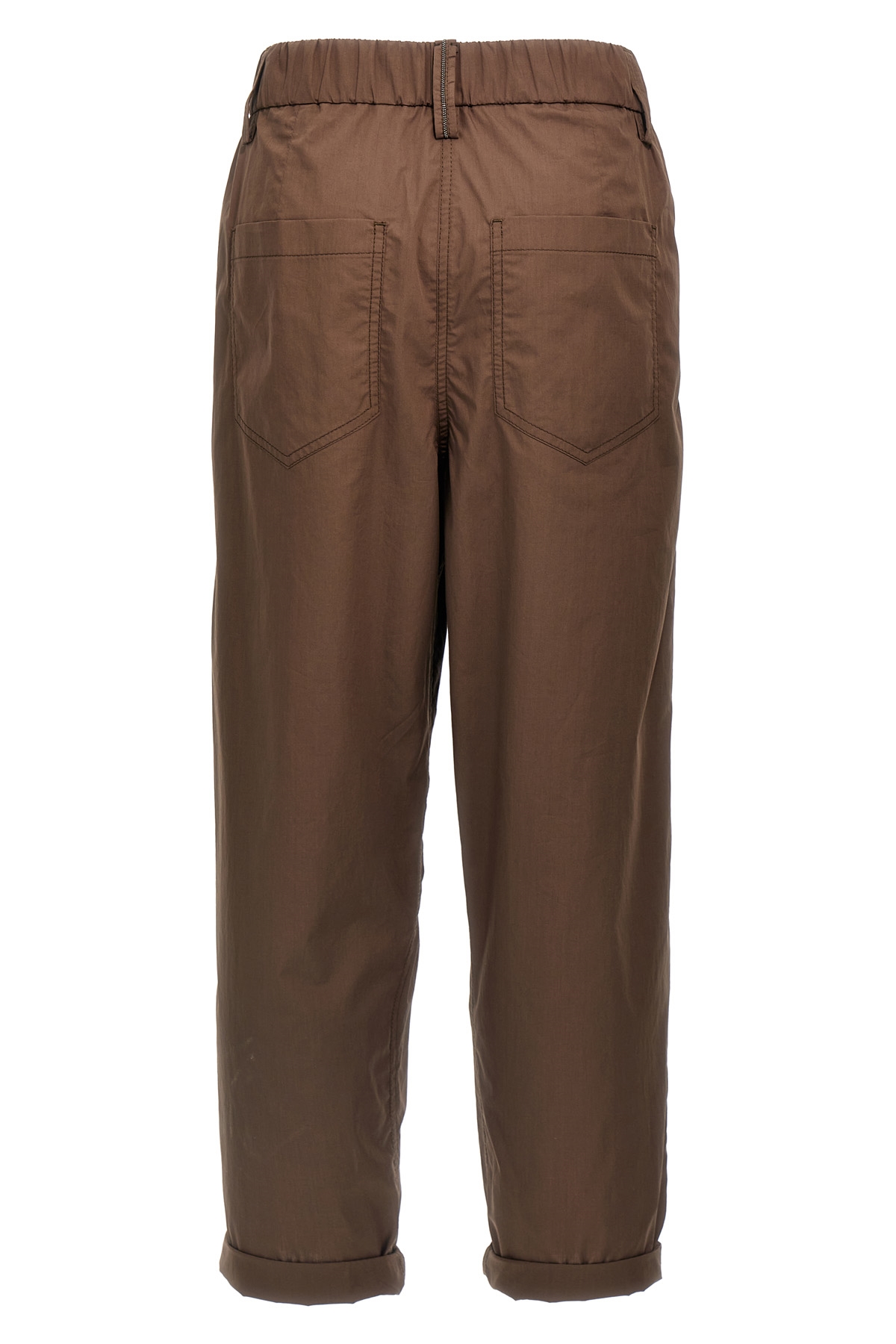 Cotton poplin pants with Monile detail on the back, elastic waistband, pockets, straight leg.