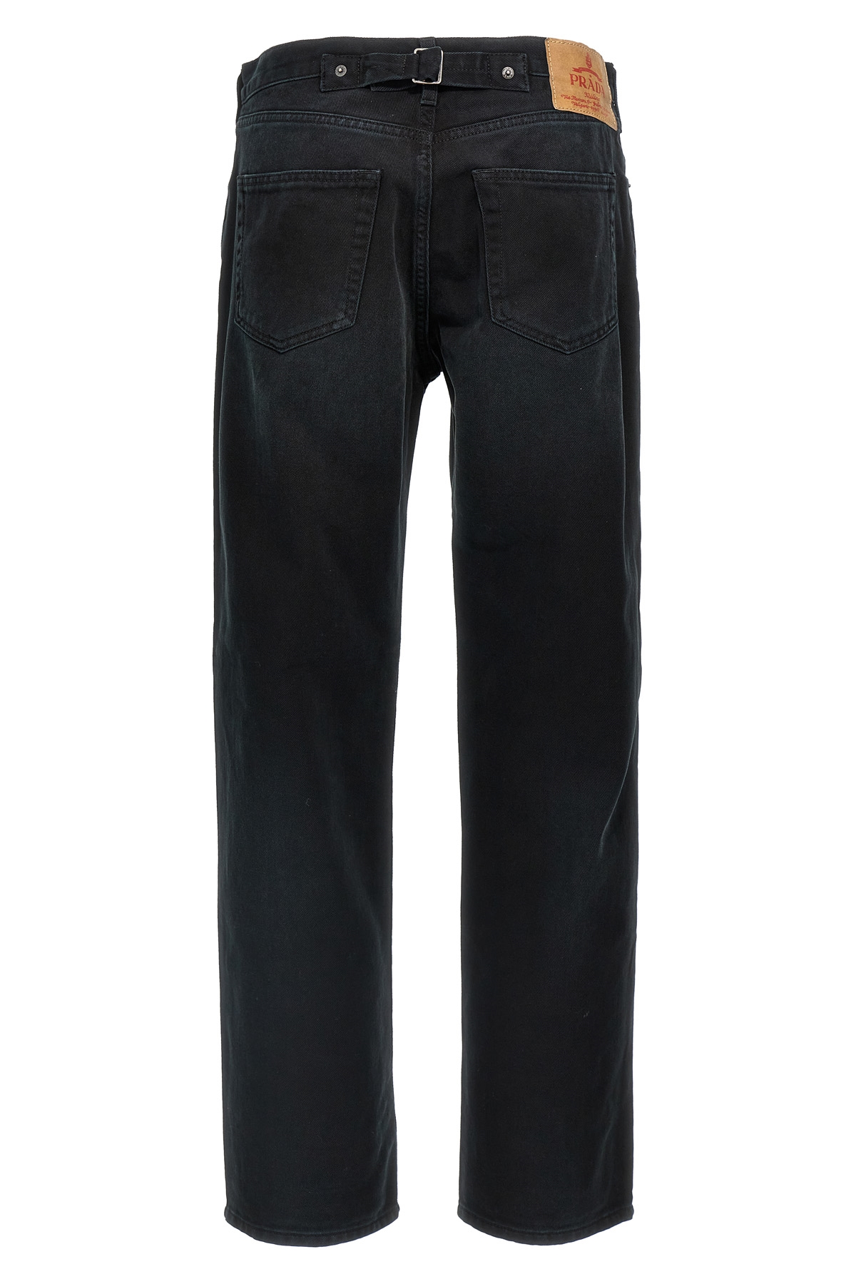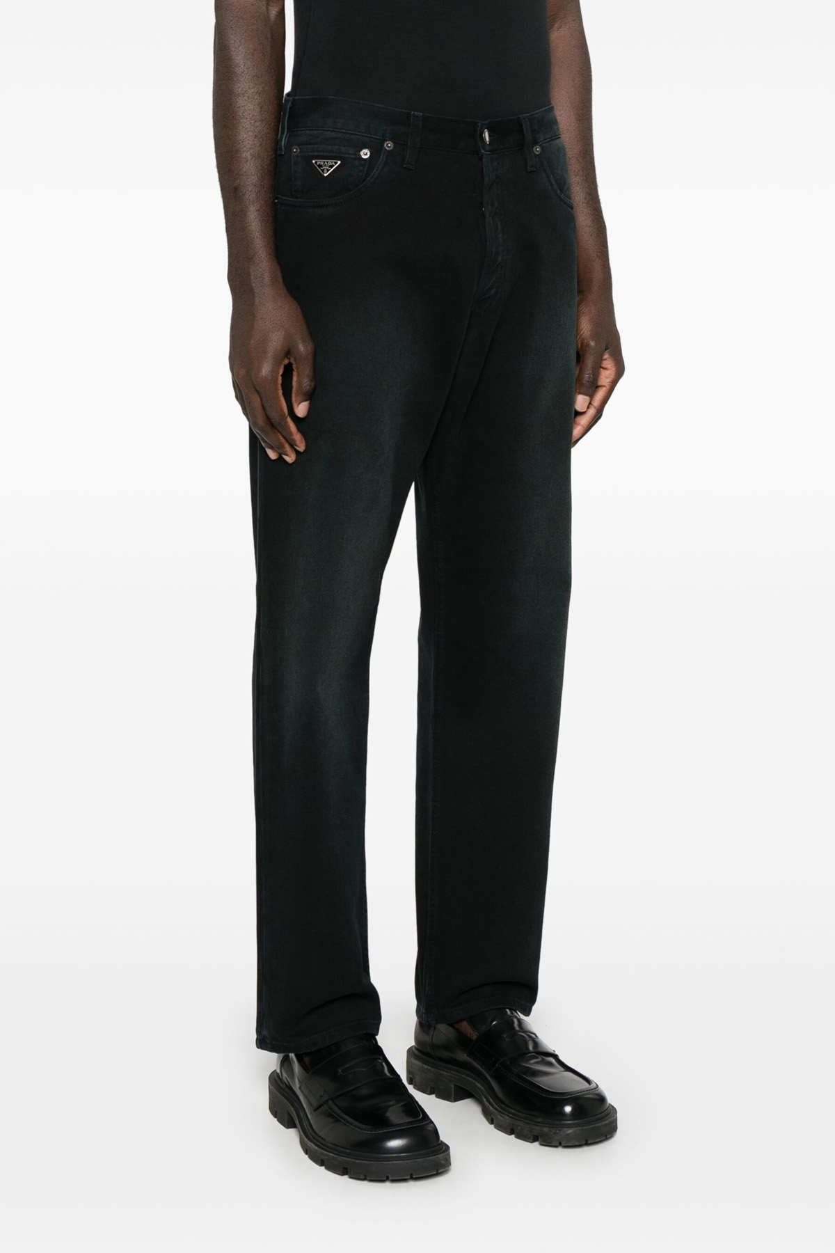 Garment-dyed cotton denim jeans, front enameled metal triangle logo, adjustable back strap, straight leg, button closure, five pockets, back logo tag.