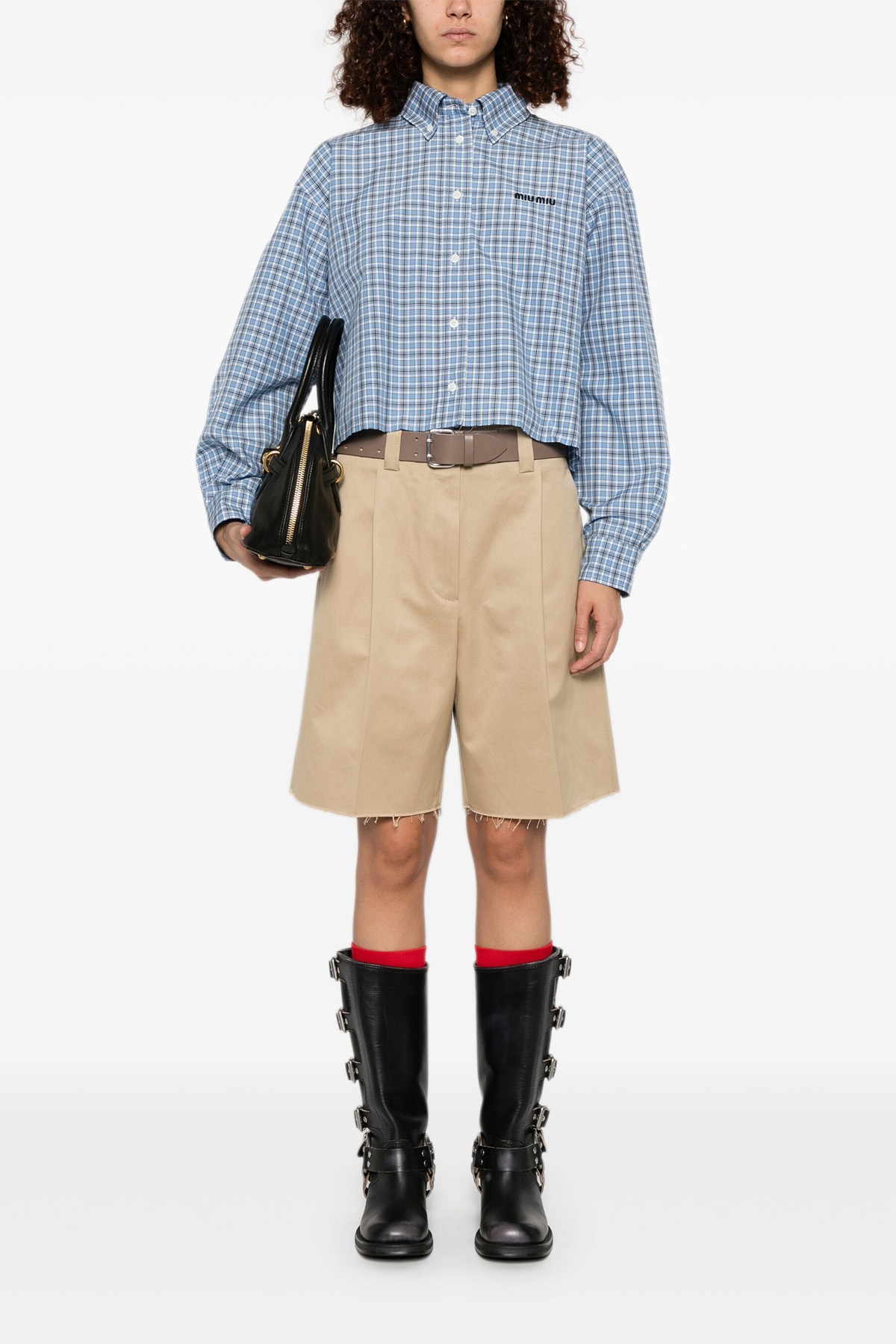 Cropped cotton shirt with button-down collar, front logo embroidery, button closure, long cuffed sleeves, and raw cut hem.