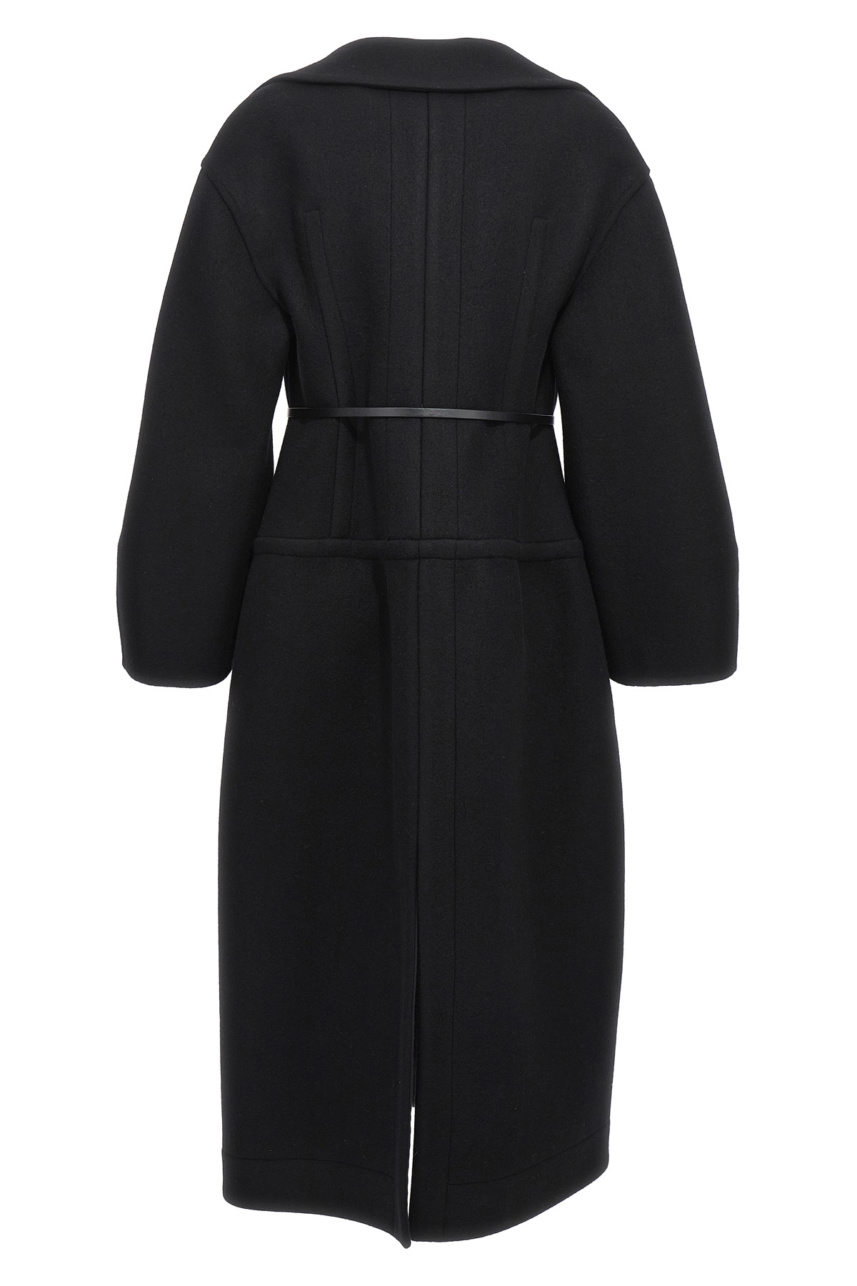 Long wool coat. Single-breasted model with button closure, removable waist belt, pockets, long sleeves, and back split.