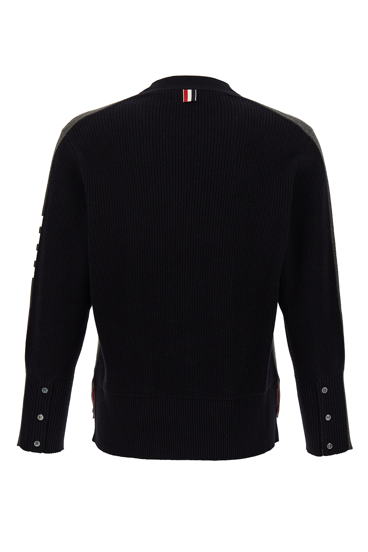 Wool blend cardigan with smooth front and ribbed back, contrast '4 Bar' detail, button closure, long cuffed sleeves, pockets.