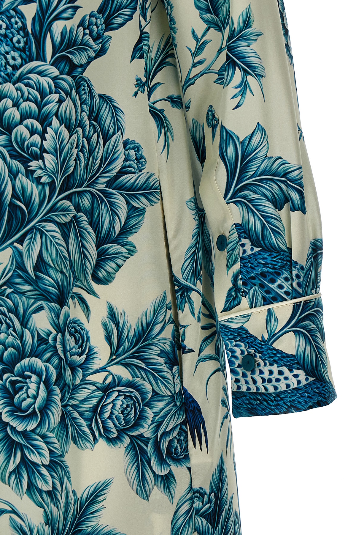 Long 'Antea' dress in silk twill with floral print with solid satin details, chemisier model, button closure, chest pocket, long cuffed sleeves.