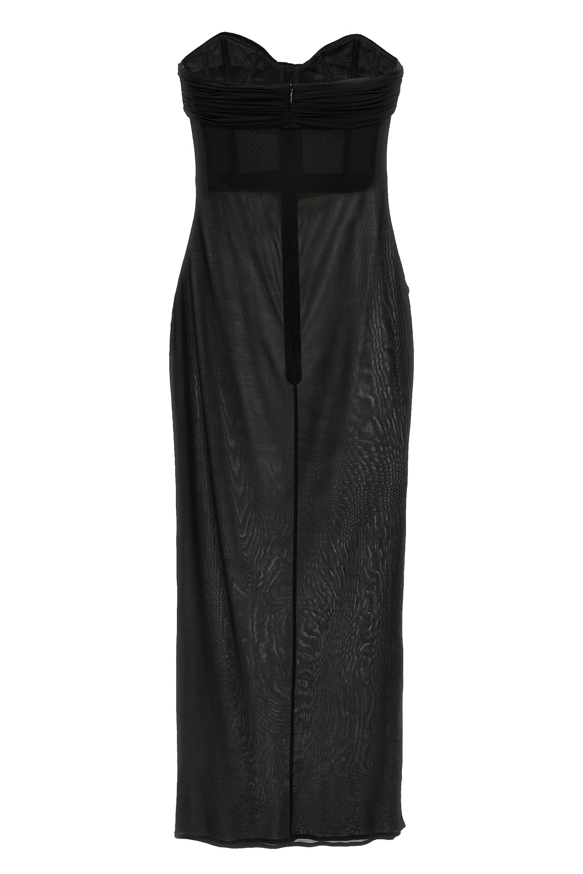 '27' midi dress in stretch cupro I don't see, off-the-shoulder model with curling on the breast and integrated bustier, back zip closure.