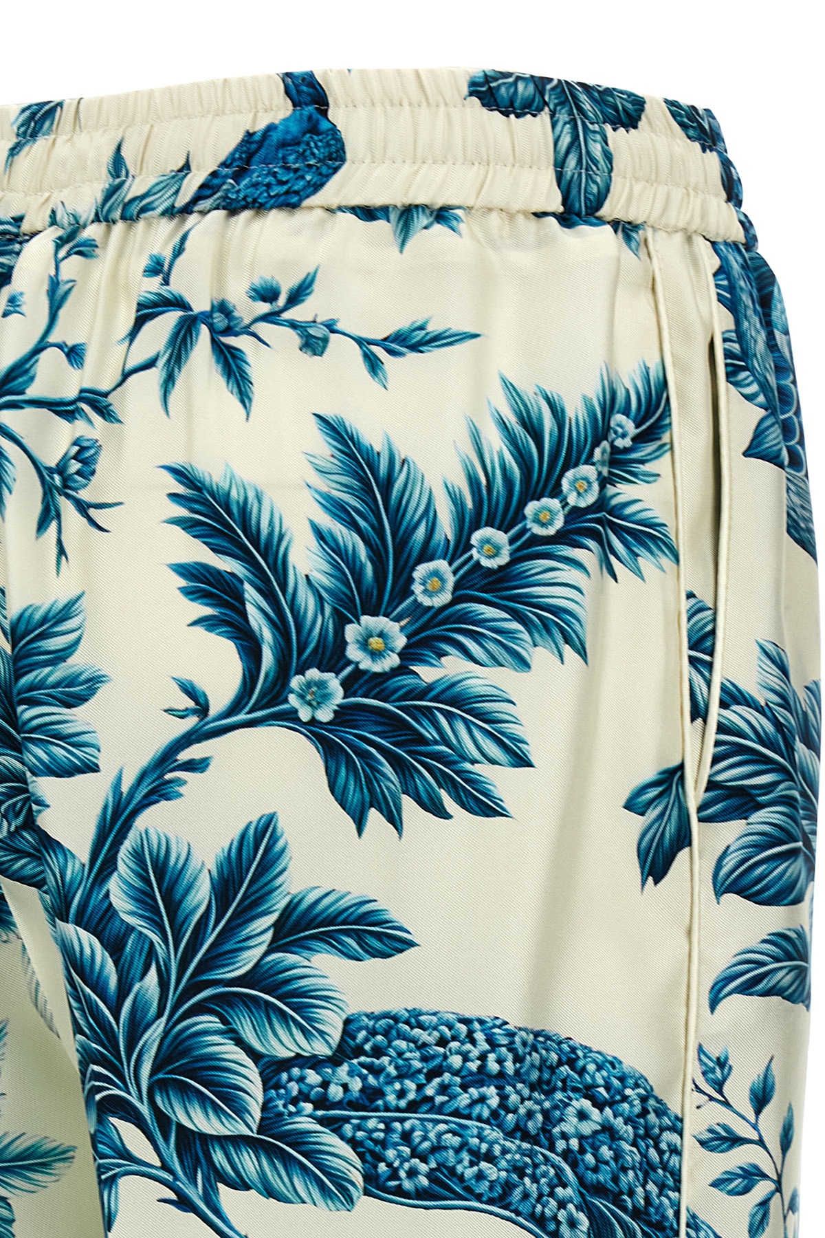 'Doride' floral print silk twill trousers with solid satin piping, adjustable drawstring elastic at the waist, pockets.
