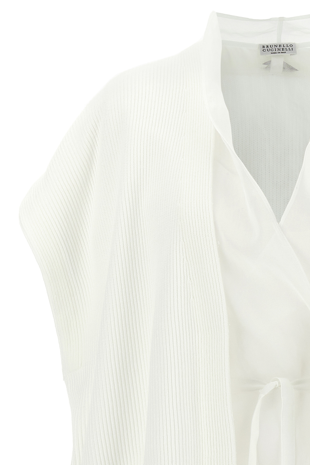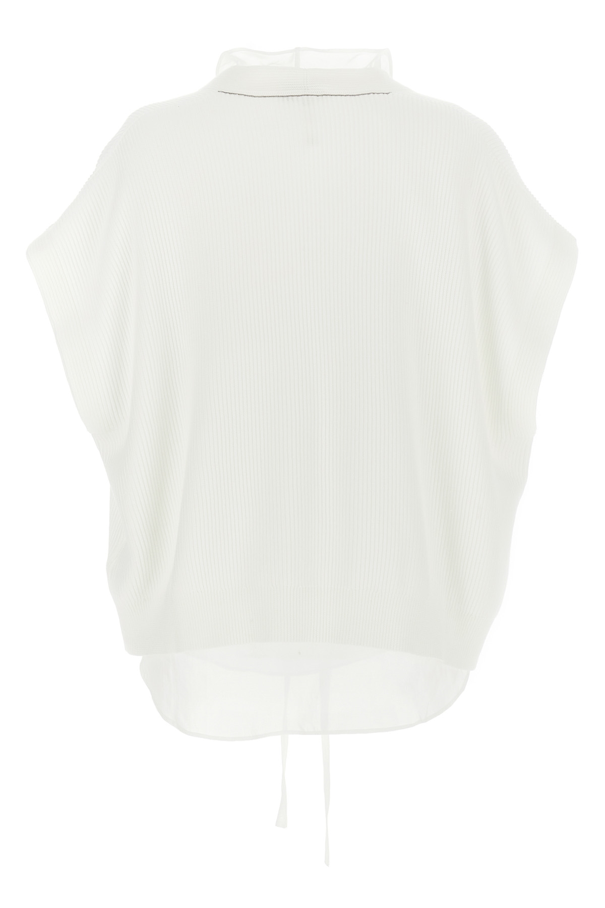 Layered English rib knit cardigan with back jewel detail and cotton organza vest with removable front drawstring closure, dropped shoulder.