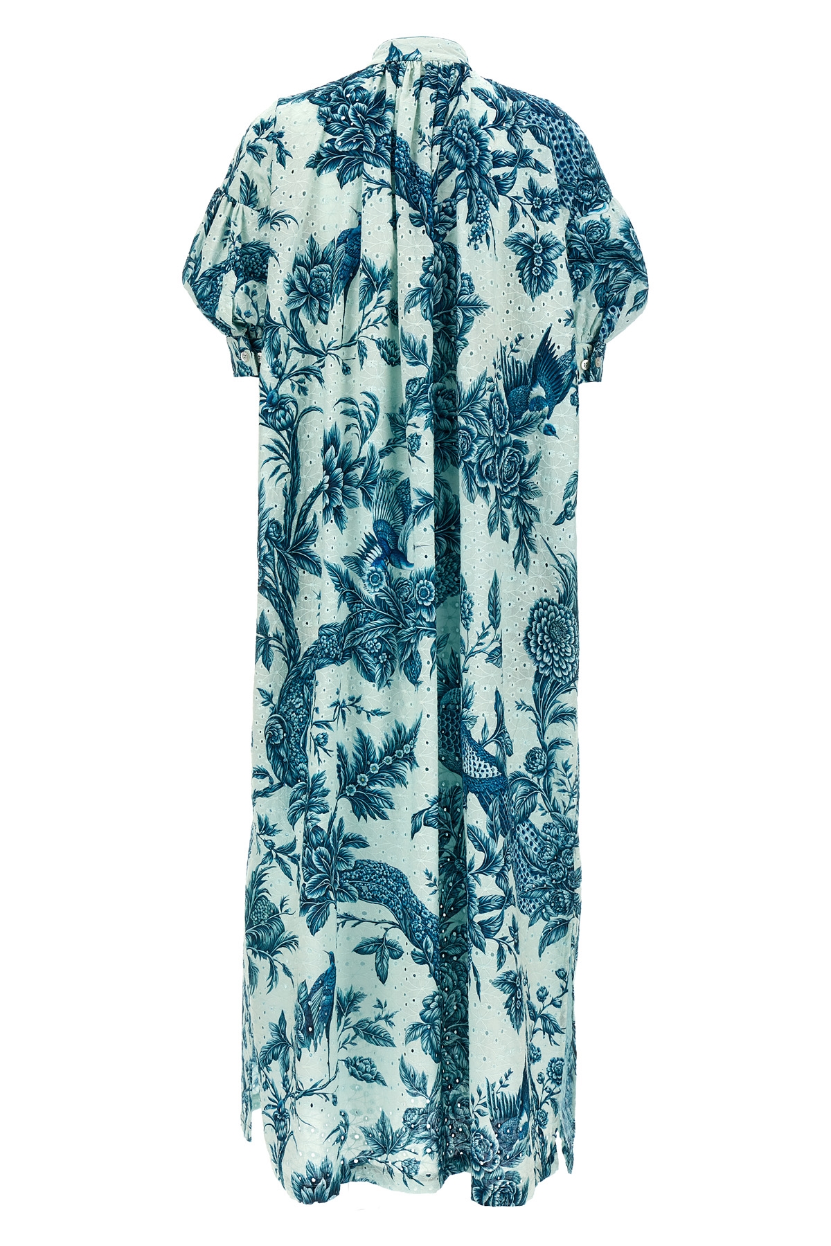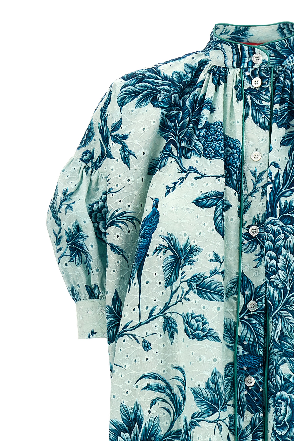 Long 'Mede' floral print sangallo lace dress with solid satin details, shirt style with mandarin collar, button closure, short balloon sleeves with dropped shoulder.