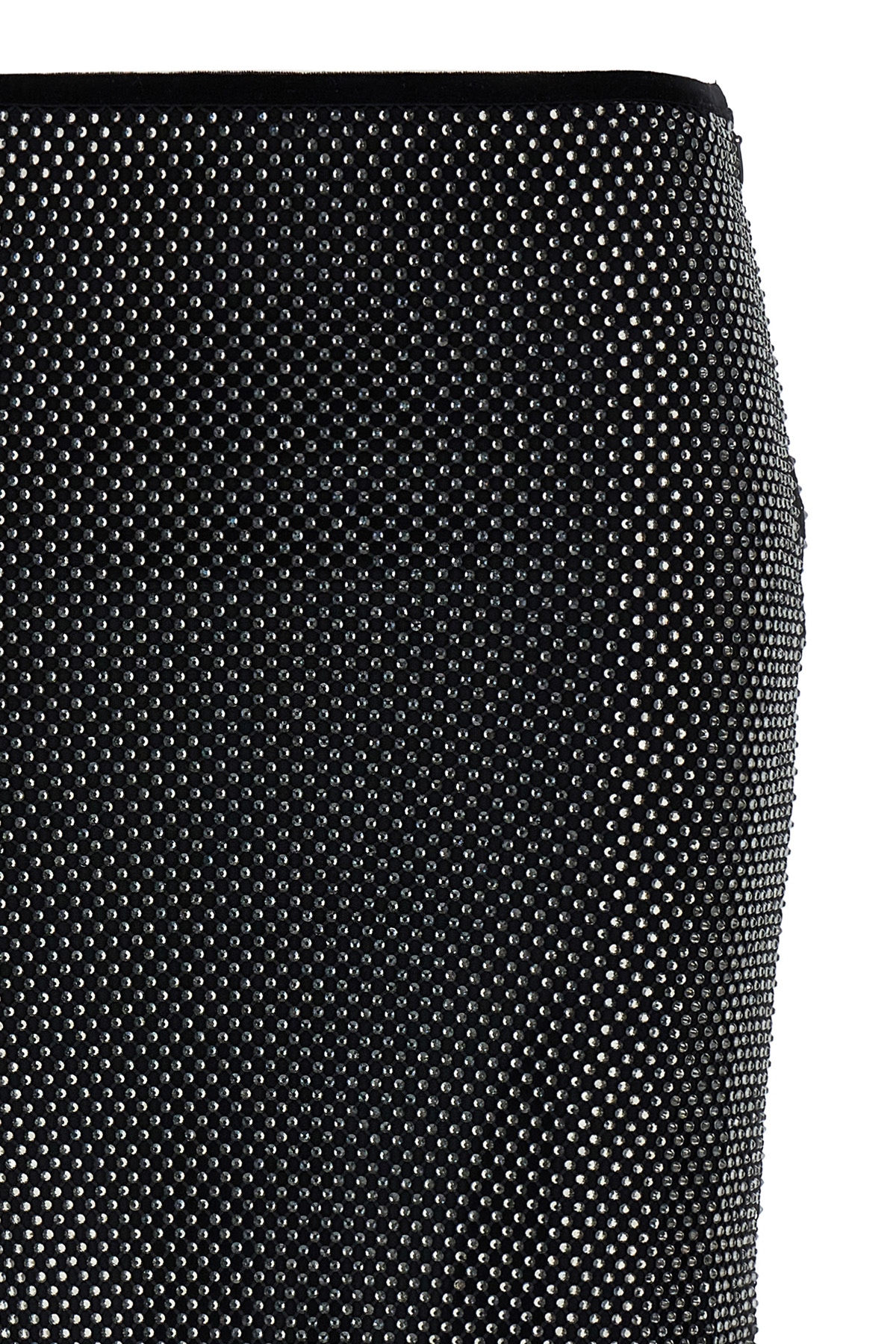 Zinnia mesh skirt with all-over rhinestone applique, velvet edging at the waist, side zip closure, removable fluid jersey lining.