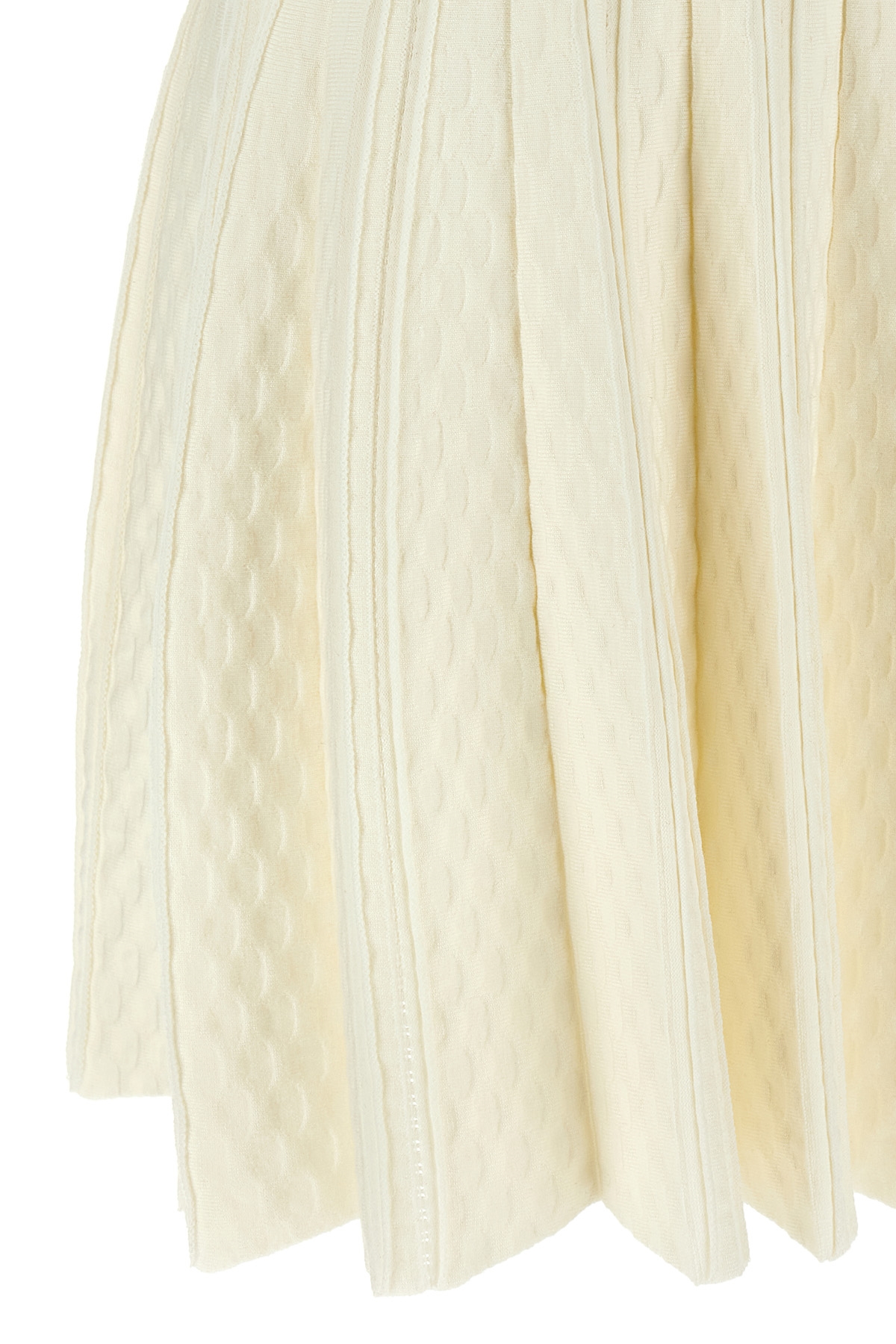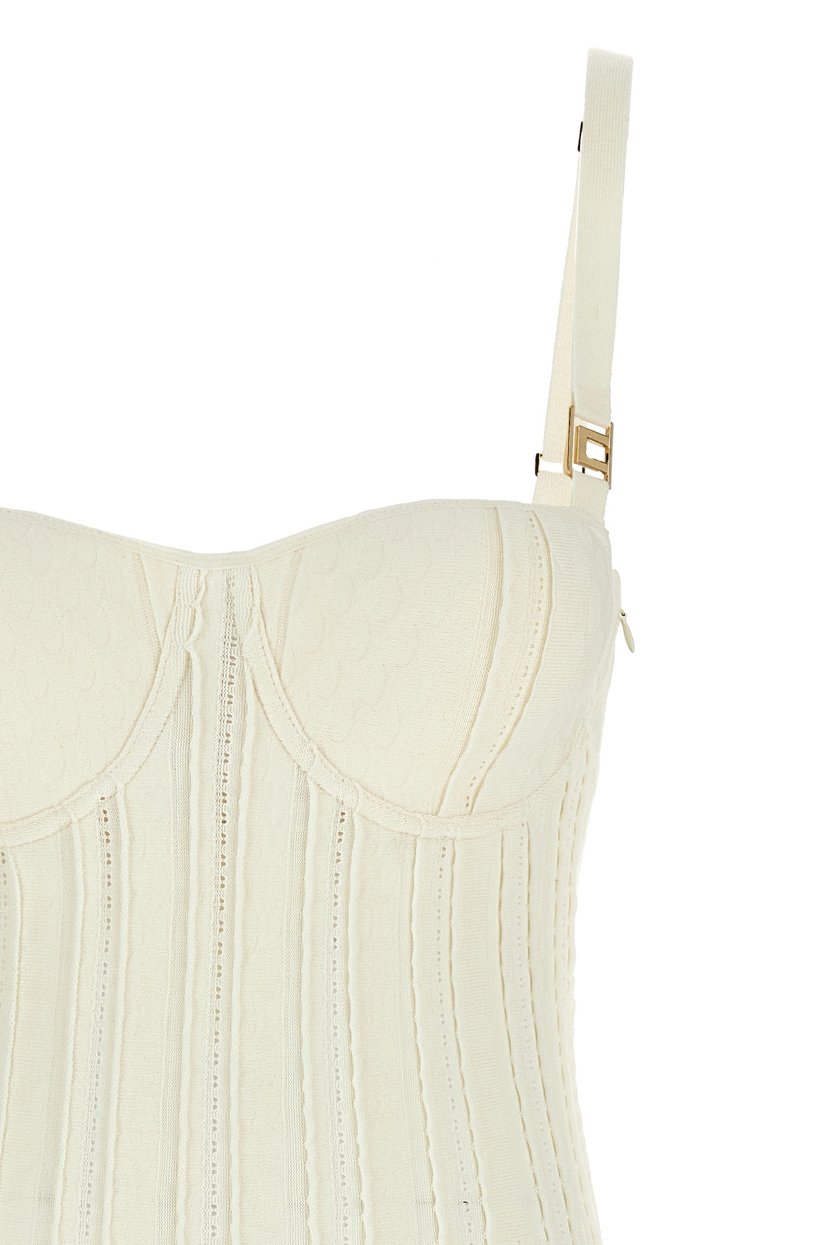 Fabric stitch knit mini dress, Bustier bra with performance cups and hook closure, thin straps with metal logo details, pleated structured skirt, side zip closure.