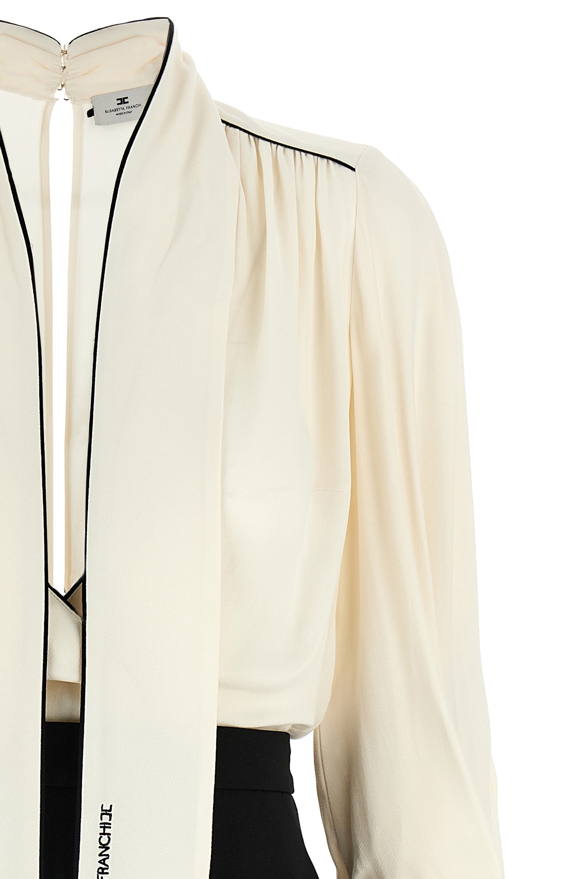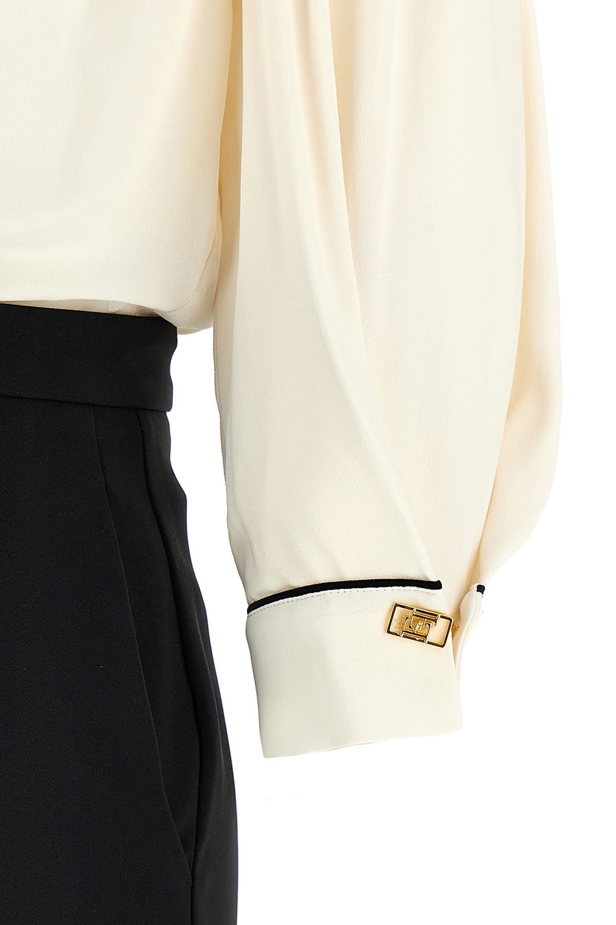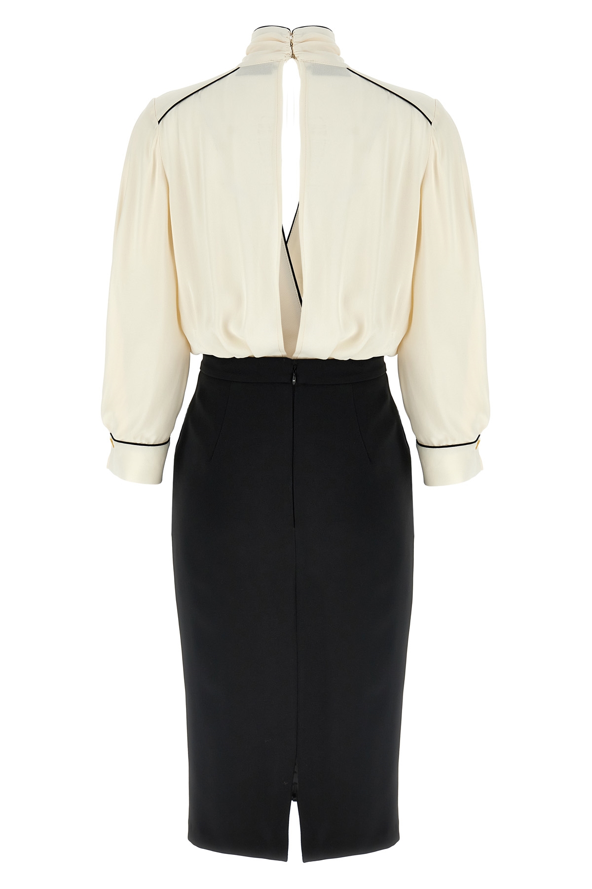 Two-piece dress with removable viscose georgette shirt, contrast piping, levalliere collar with hook closure, V-neck front and back, long sleeves with gold metal cuffs and cufflinks, crepe skirt, midi sheath skirt, pockets, zip closure and back split.