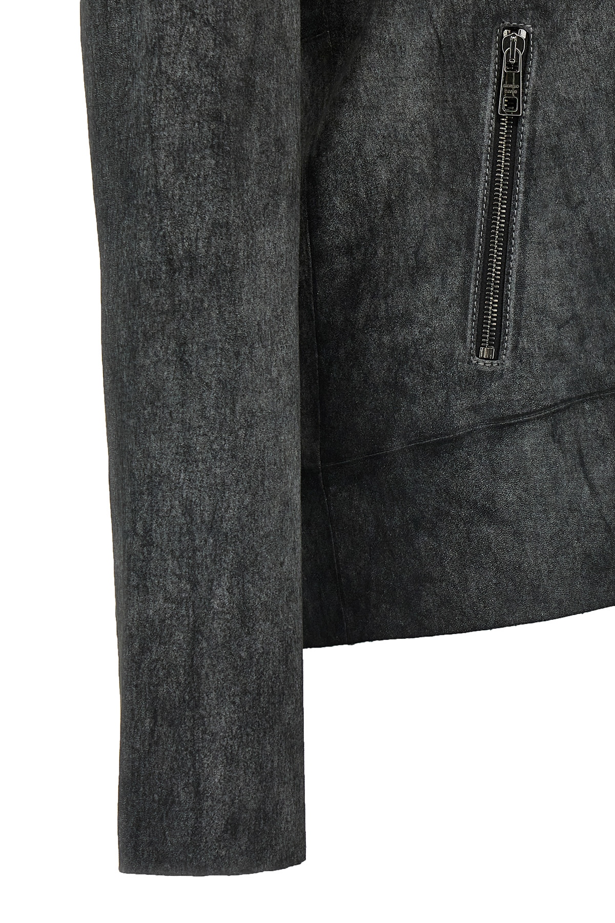 Vintage stretch vegetable tanned leather jacket with zip closure, zip pockets, crew neck with snap button, long sleeves, raw cut hem.