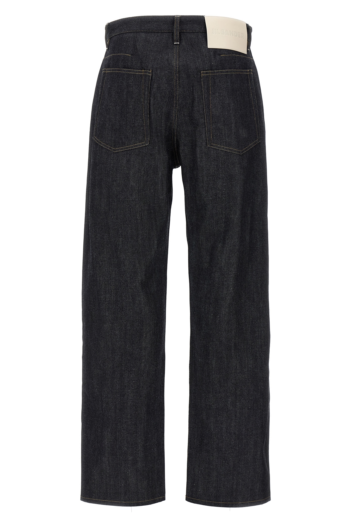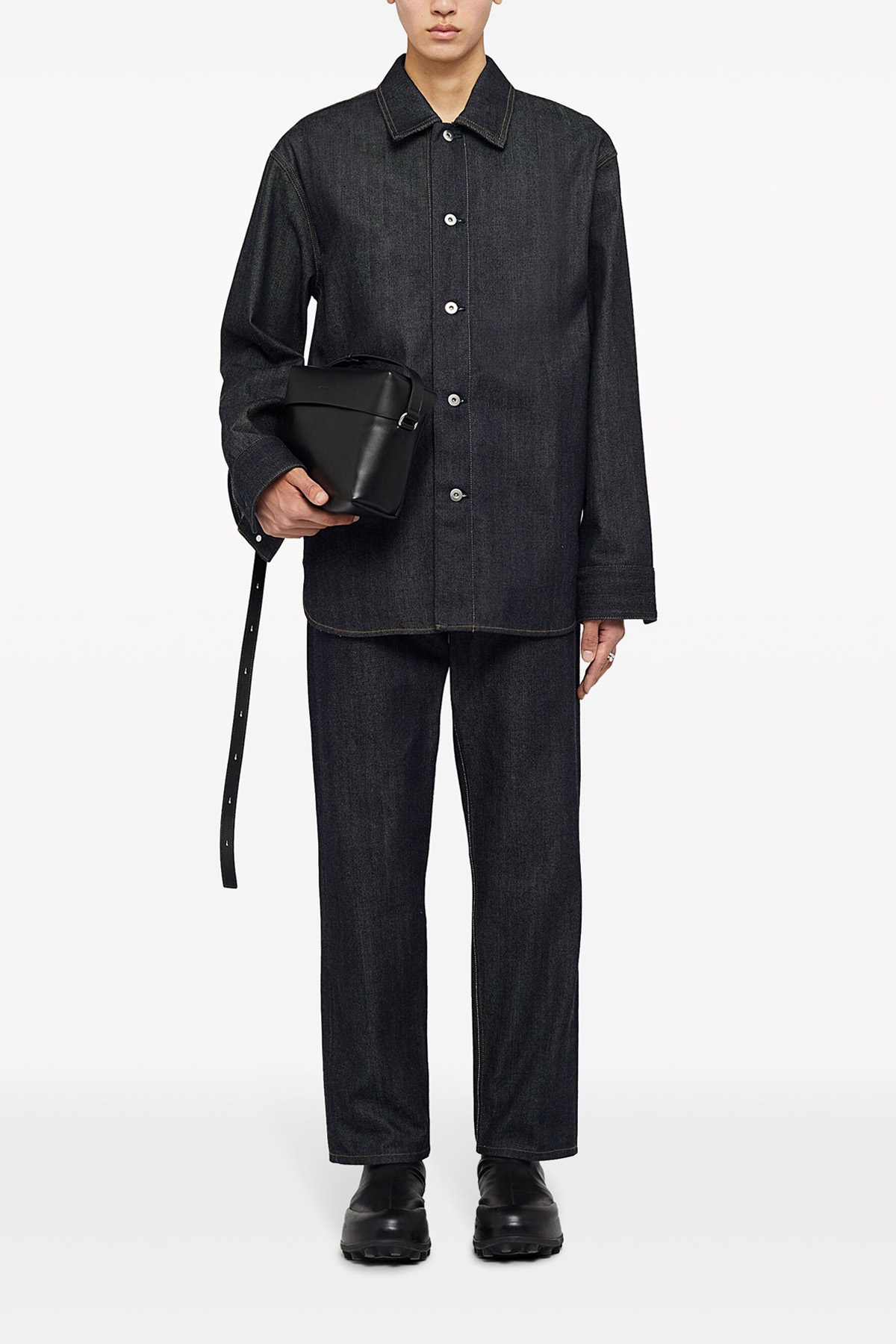 W Denim 01 jeans in Japanese cotton denim with loose, straight leg, button closure, five pockets, and leather logo label on the back.