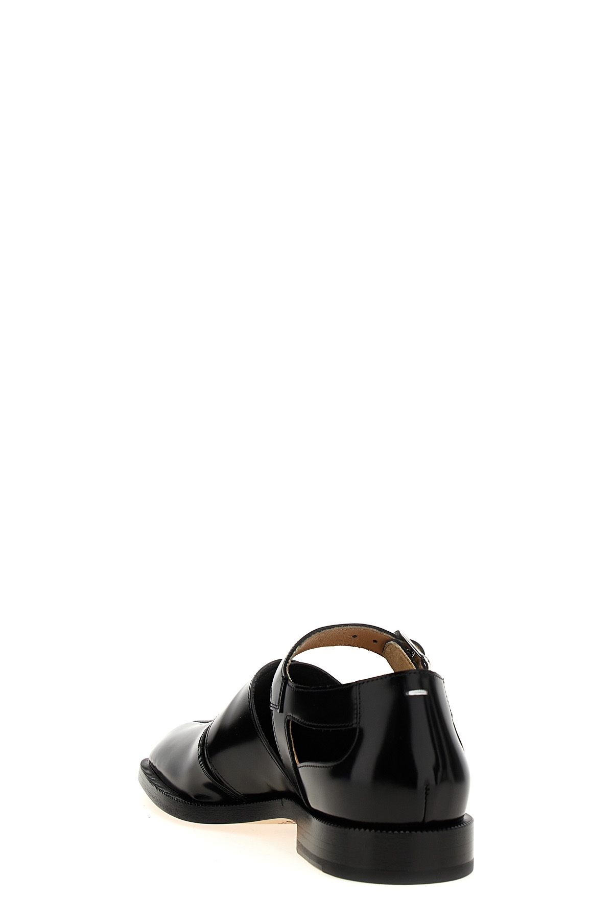 Mary Jane 'Tabi' in leather with cut-out details, adjustable strap with silver buckle, iconic split toe, leather sole.