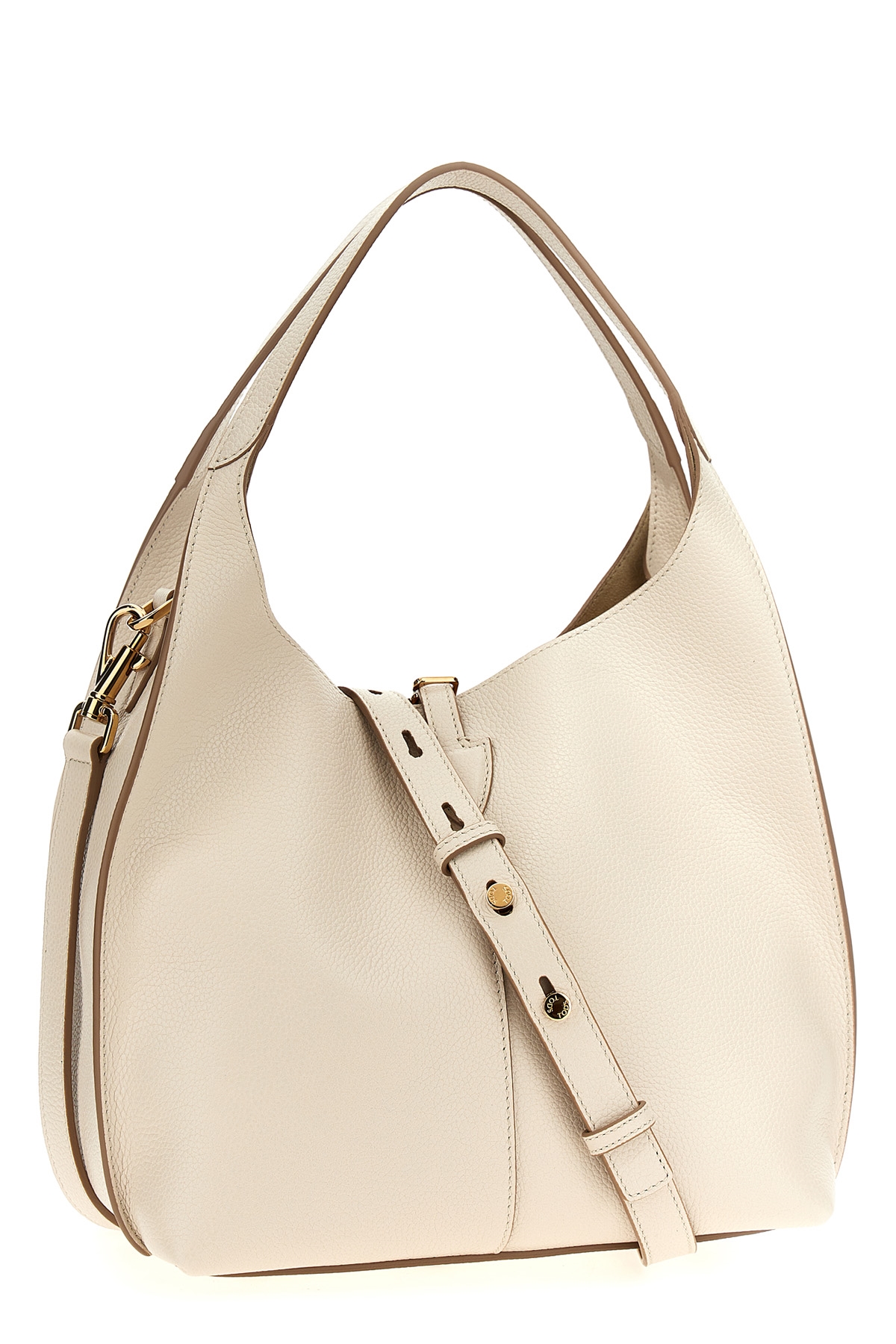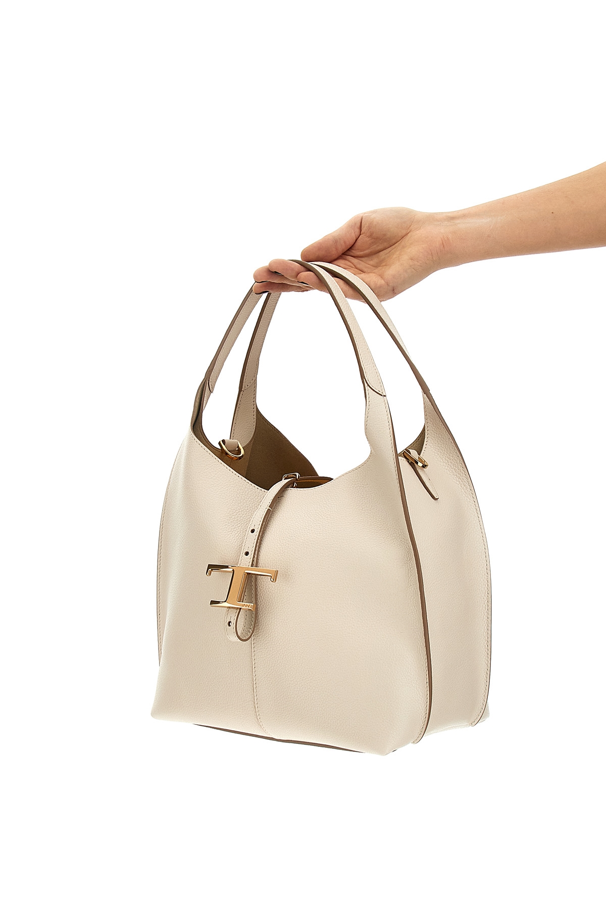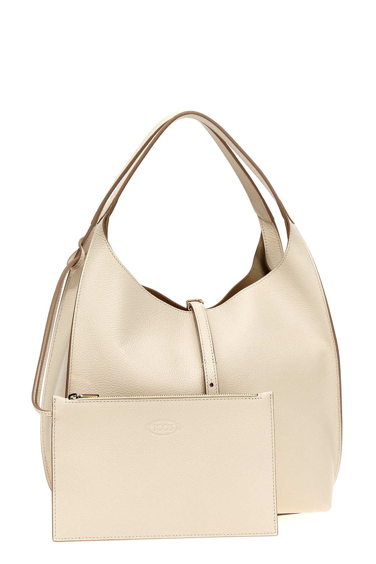 Granata leather shoulder bag with metal 'T Timeless' pendant, hook closure, double fixed handle, adjustable and removable shoulder strap, and removable inner matching clutch.